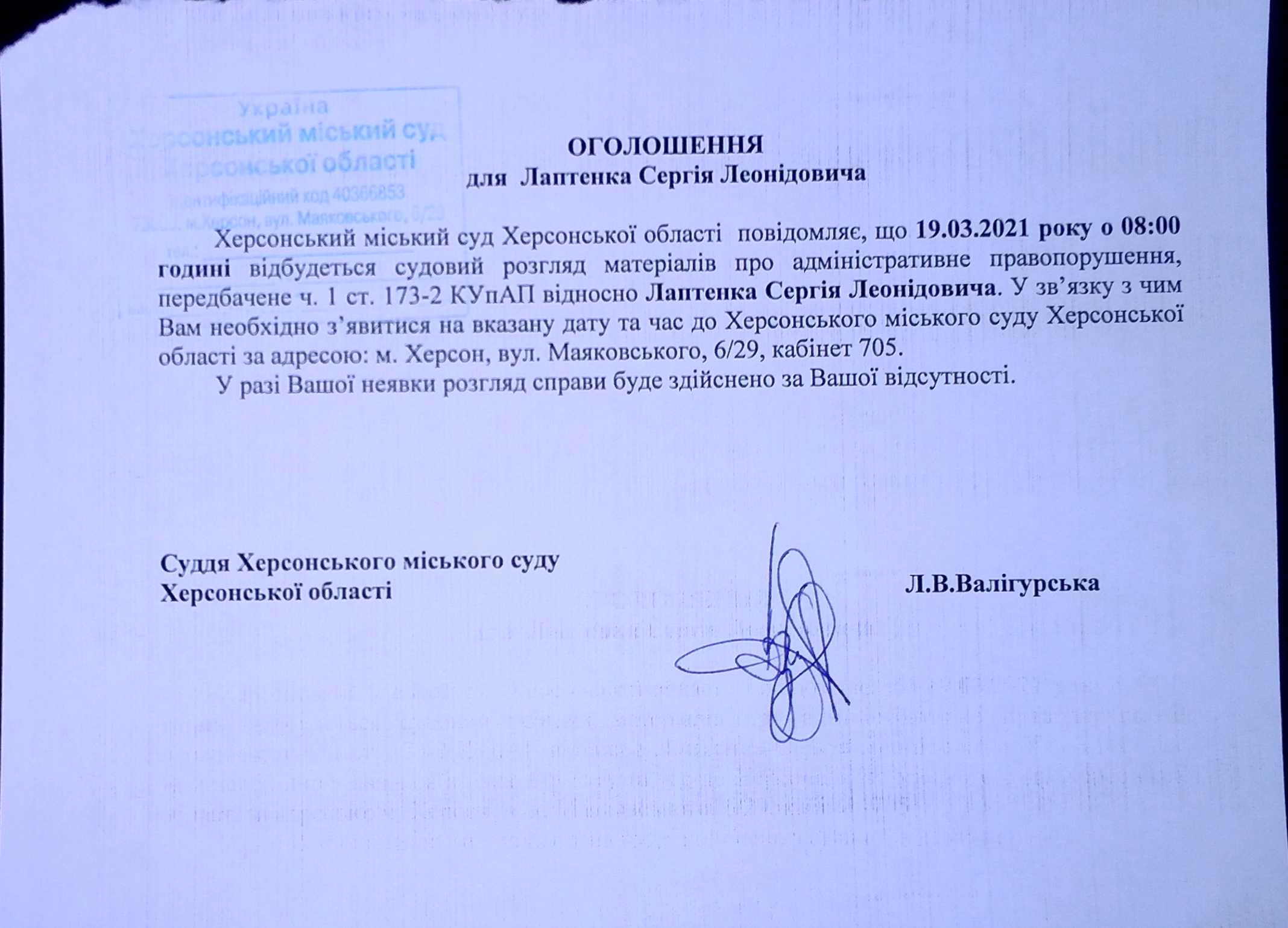 ОГОЛОШЕННЯ для Лаптенка Сергія Леонідовича