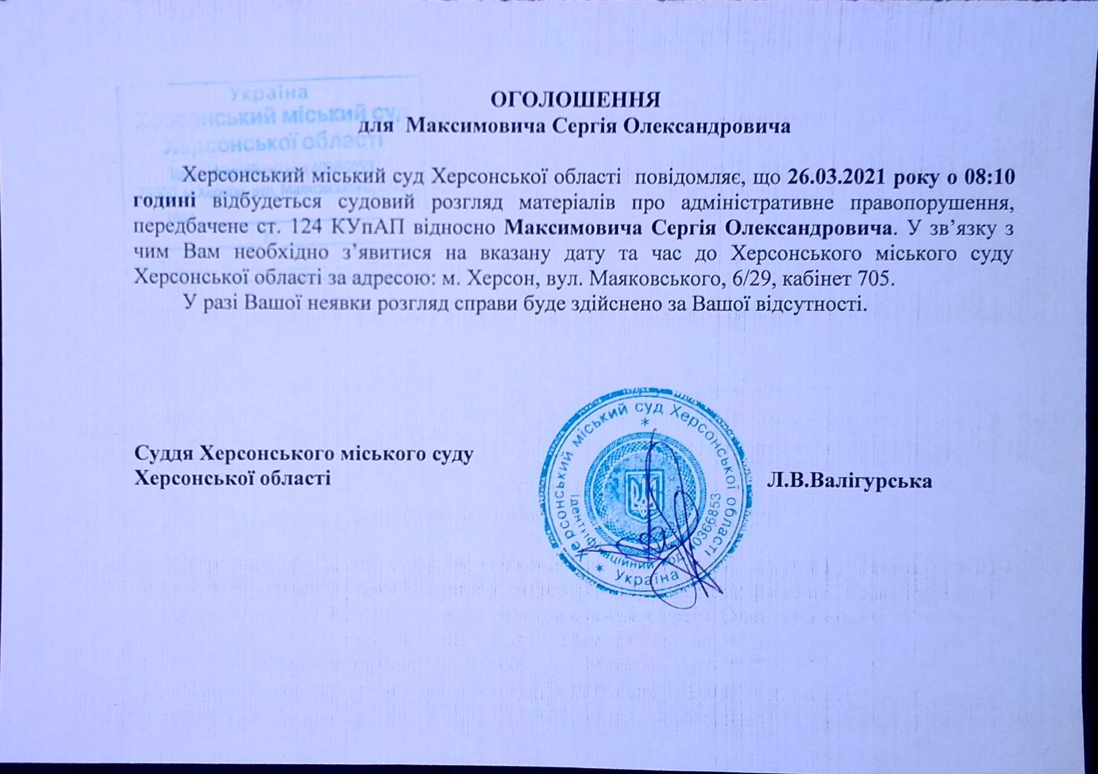 ОГОЛОШЕННЯ для Максимовича Сергія Олександровича