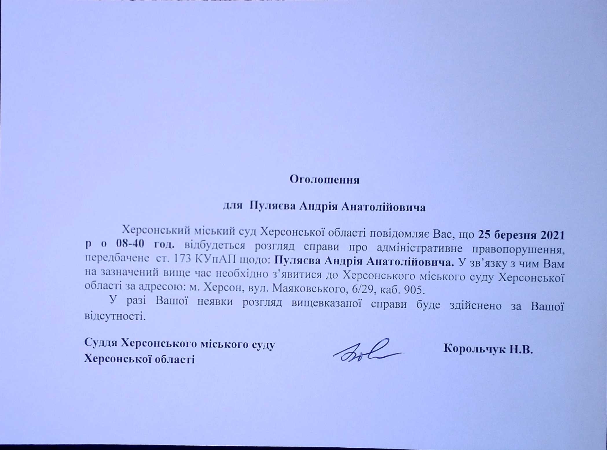 ОГОЛОШЕННЯ для Пуляєва Андрія Анатолійовича