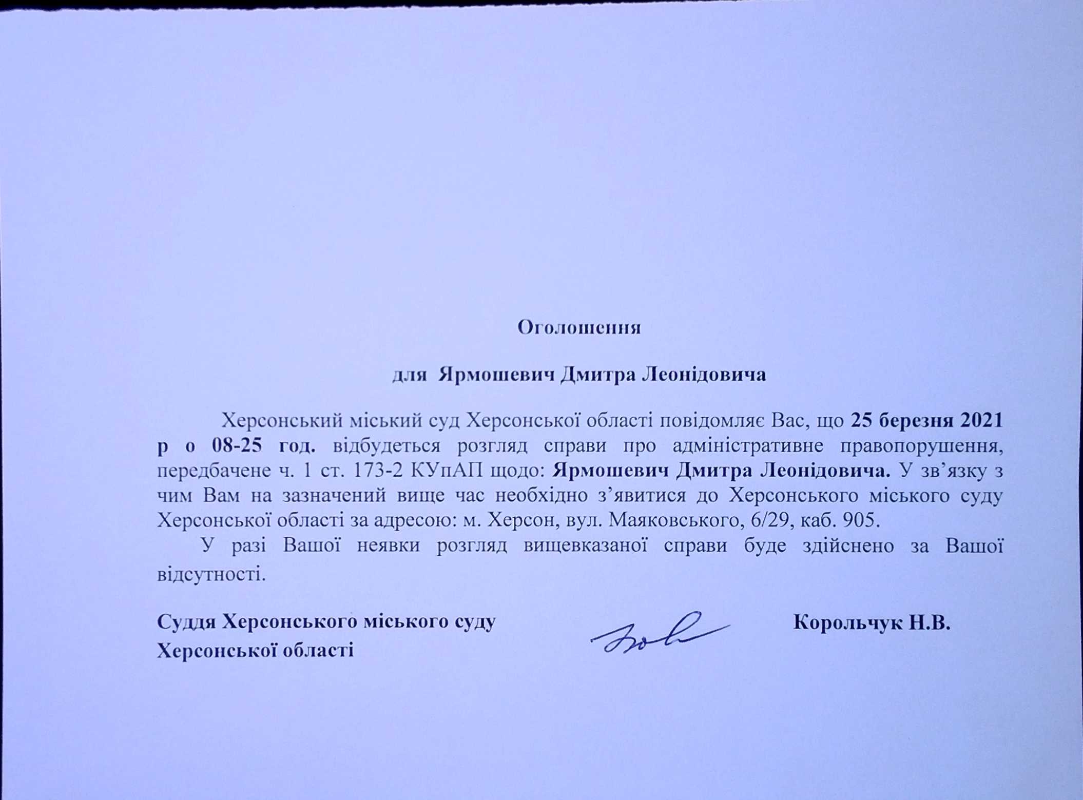ОГОЛОШЕННЯ для Ярмошевича Дмитра Леонідовича