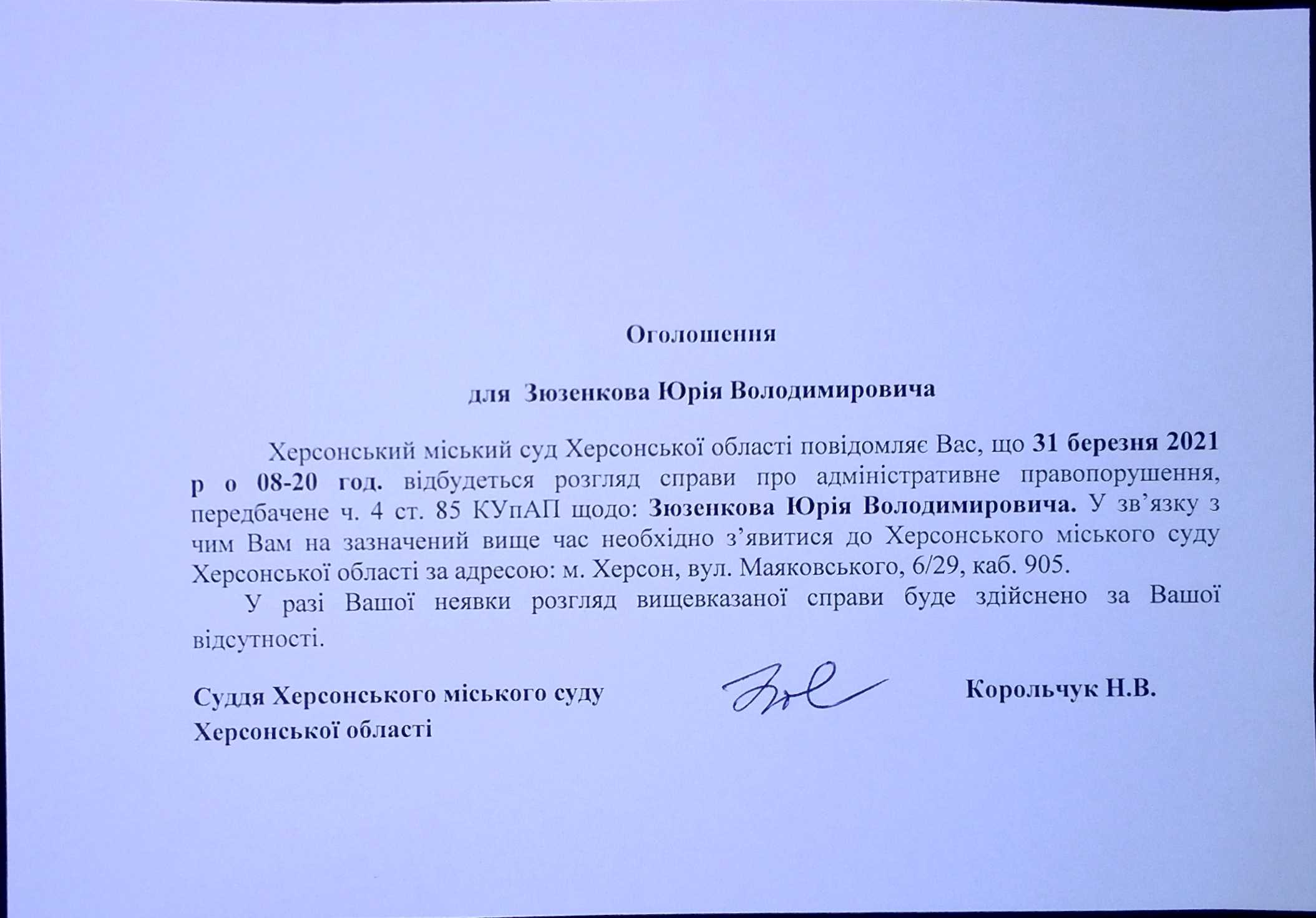 ОГОЛОШЕННЯ ПРО ВИКЛИК ДО СУДУ