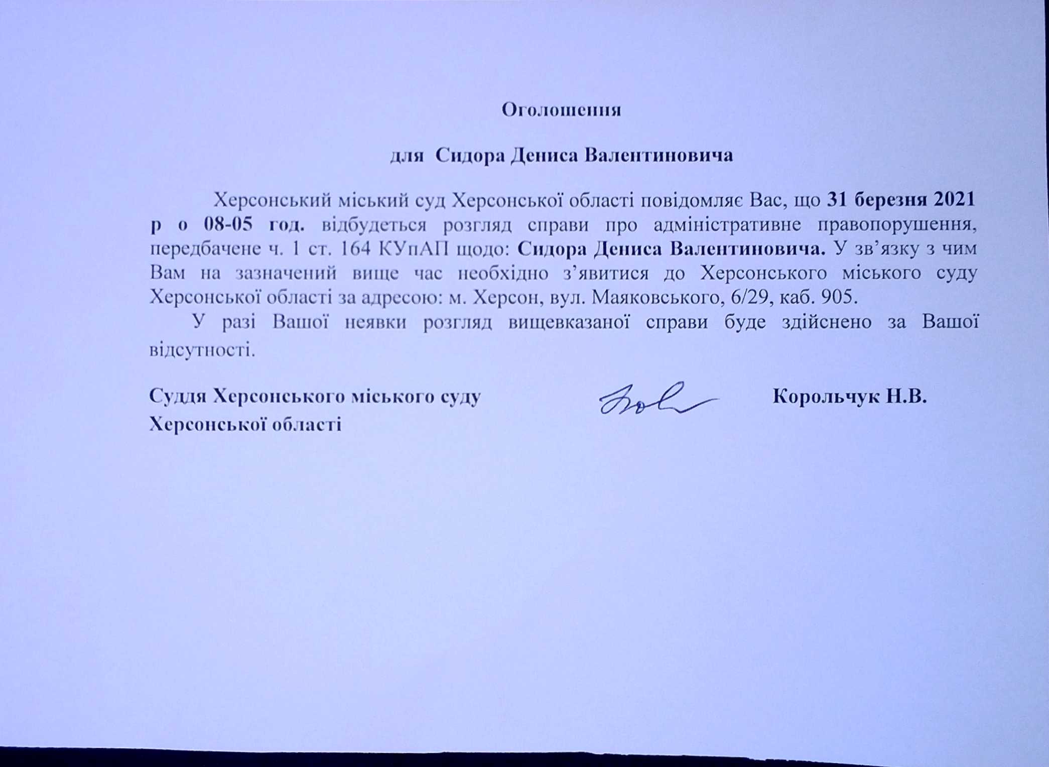 ОГОЛОШЕННЯ для Сидора Дениса Валентиновича