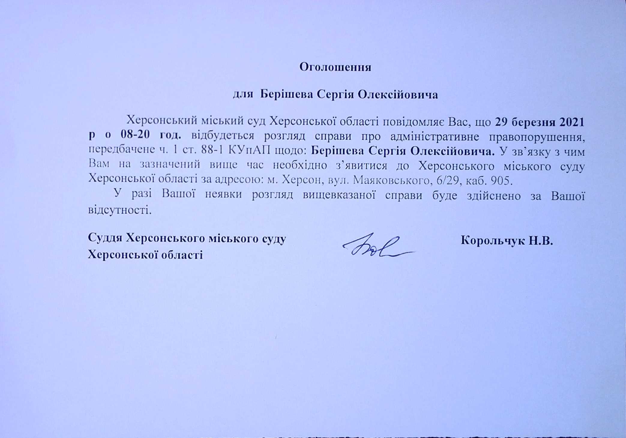 ОГОЛОШЕННЯ для Берішева Сергія Олексійовича