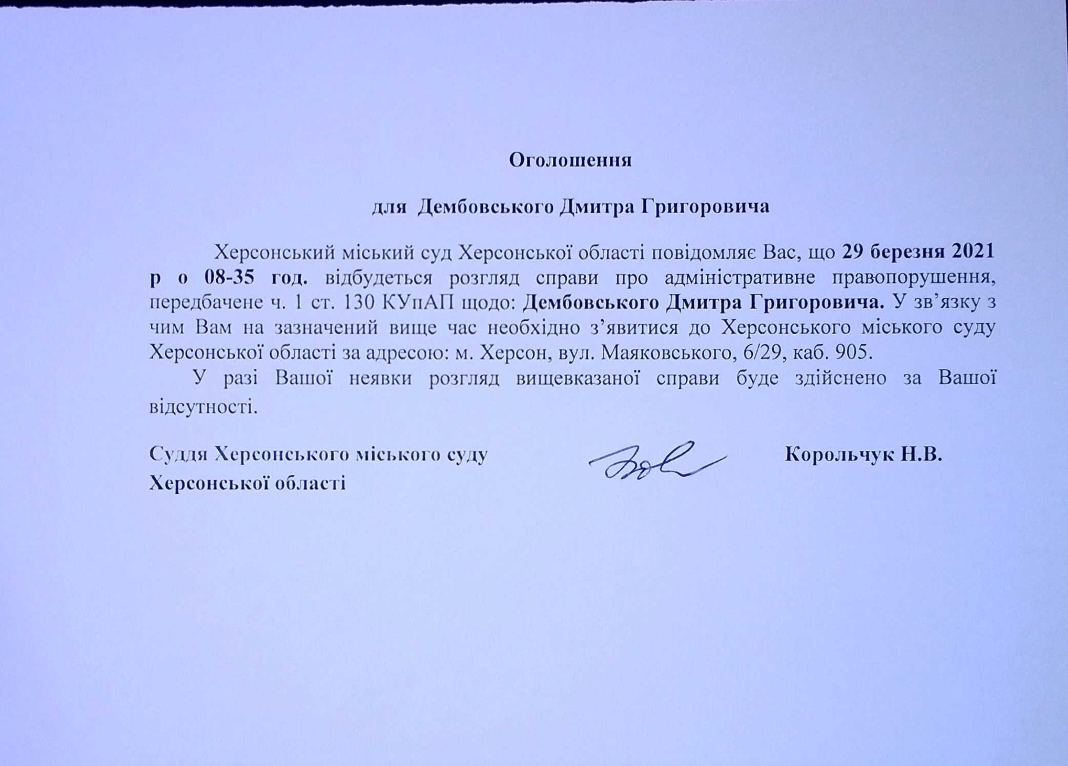 ОГОЛОШЕННЯ для Дембовського Дмитра Григоровича