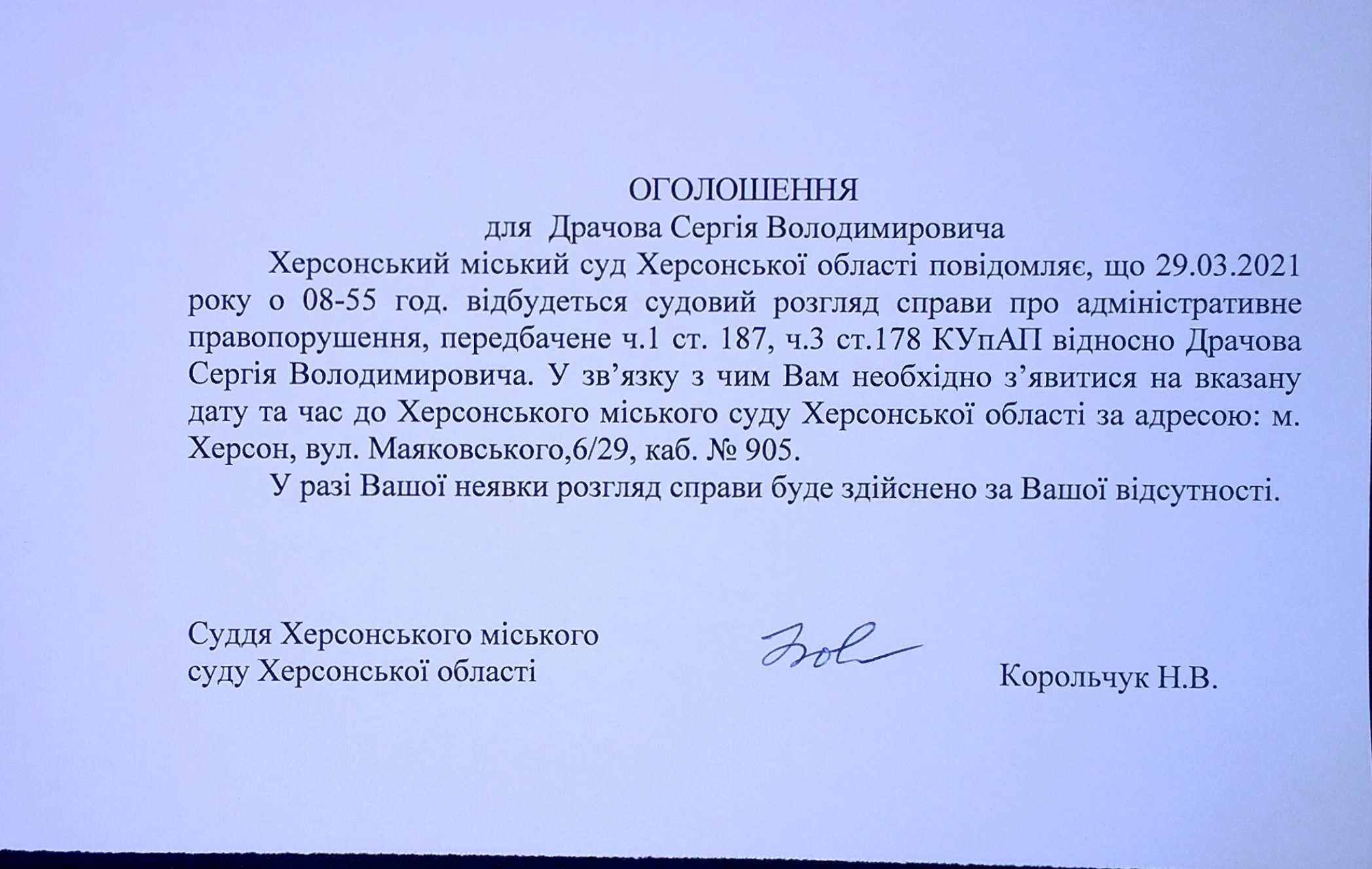 ОГОЛОШЕННЯ для Драчова Сергія Володимировича