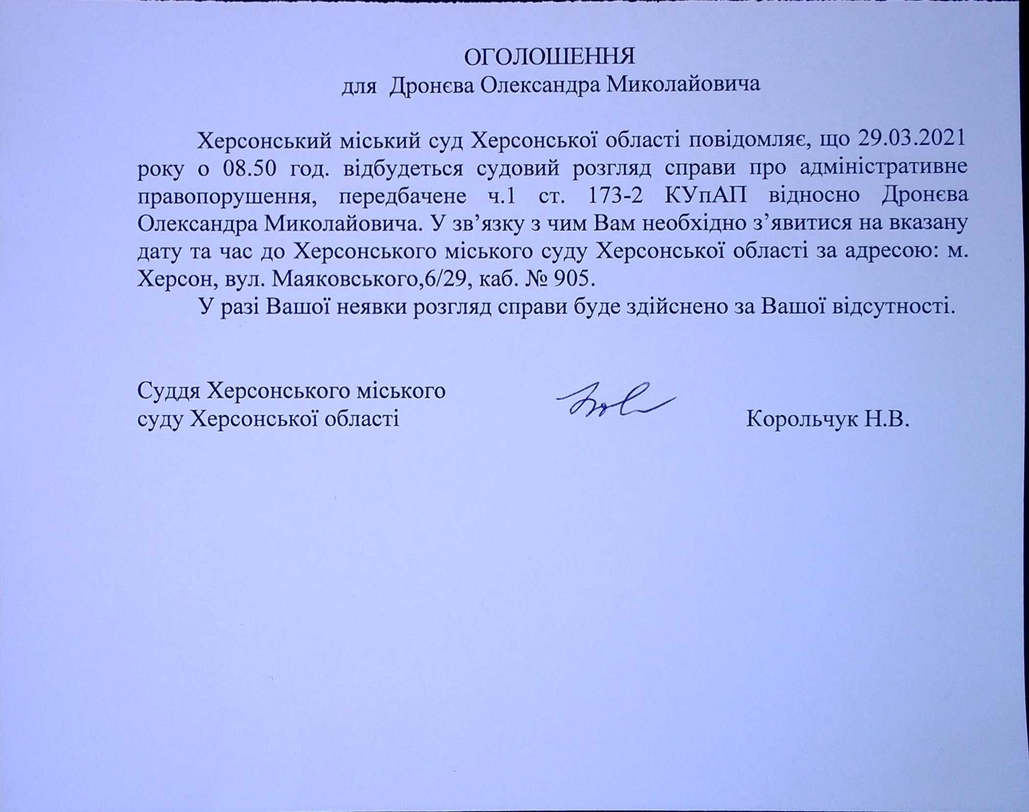 ОГОЛОШЕННЯ для Дронєва Олександра Миколайовича