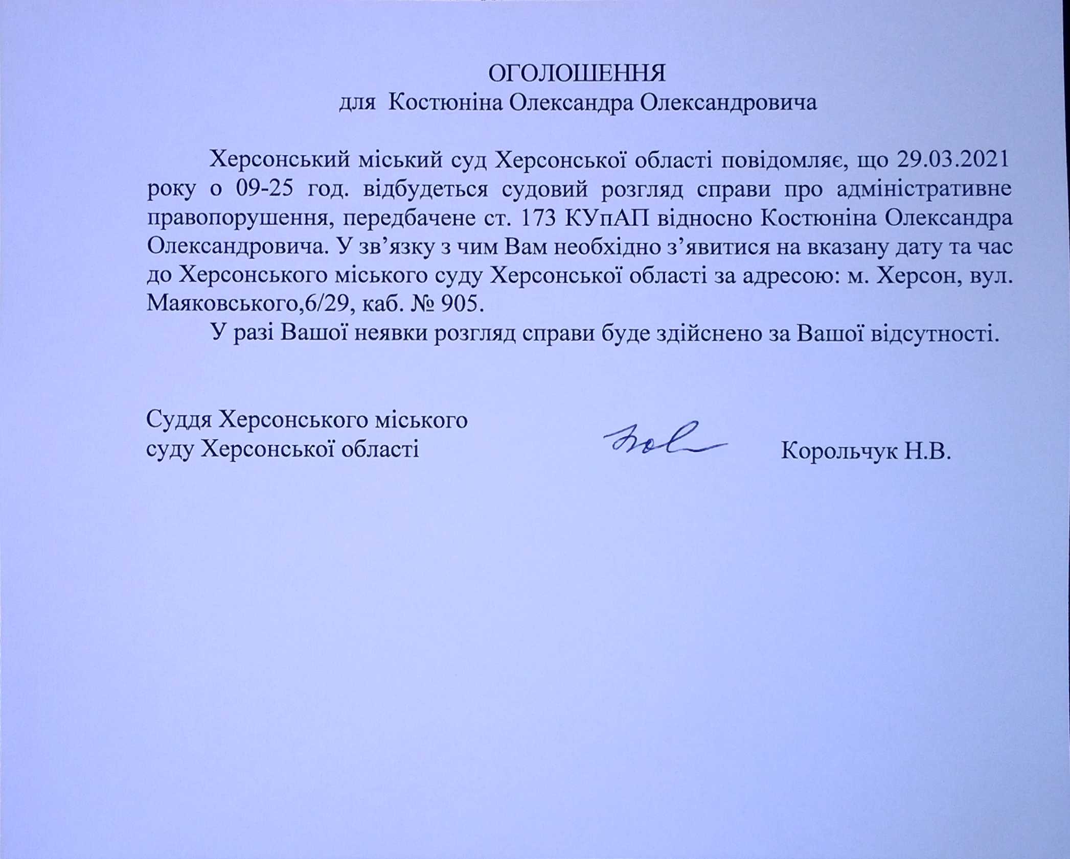 ОГОЛОШЕННЯ для Костюніна Олександра Олександровича