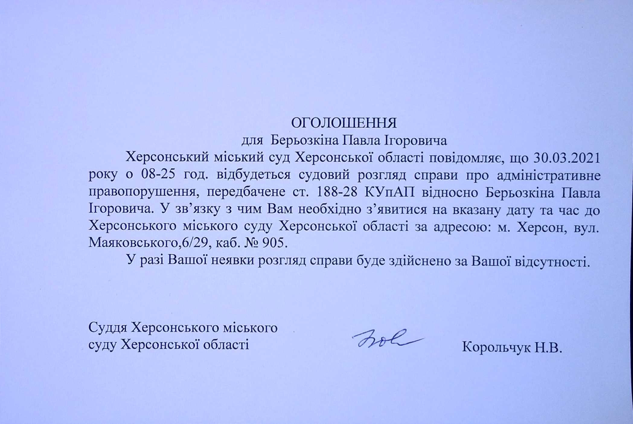 ОГОЛОШЕННЯ для Берьозкіна Павла Ігоровича