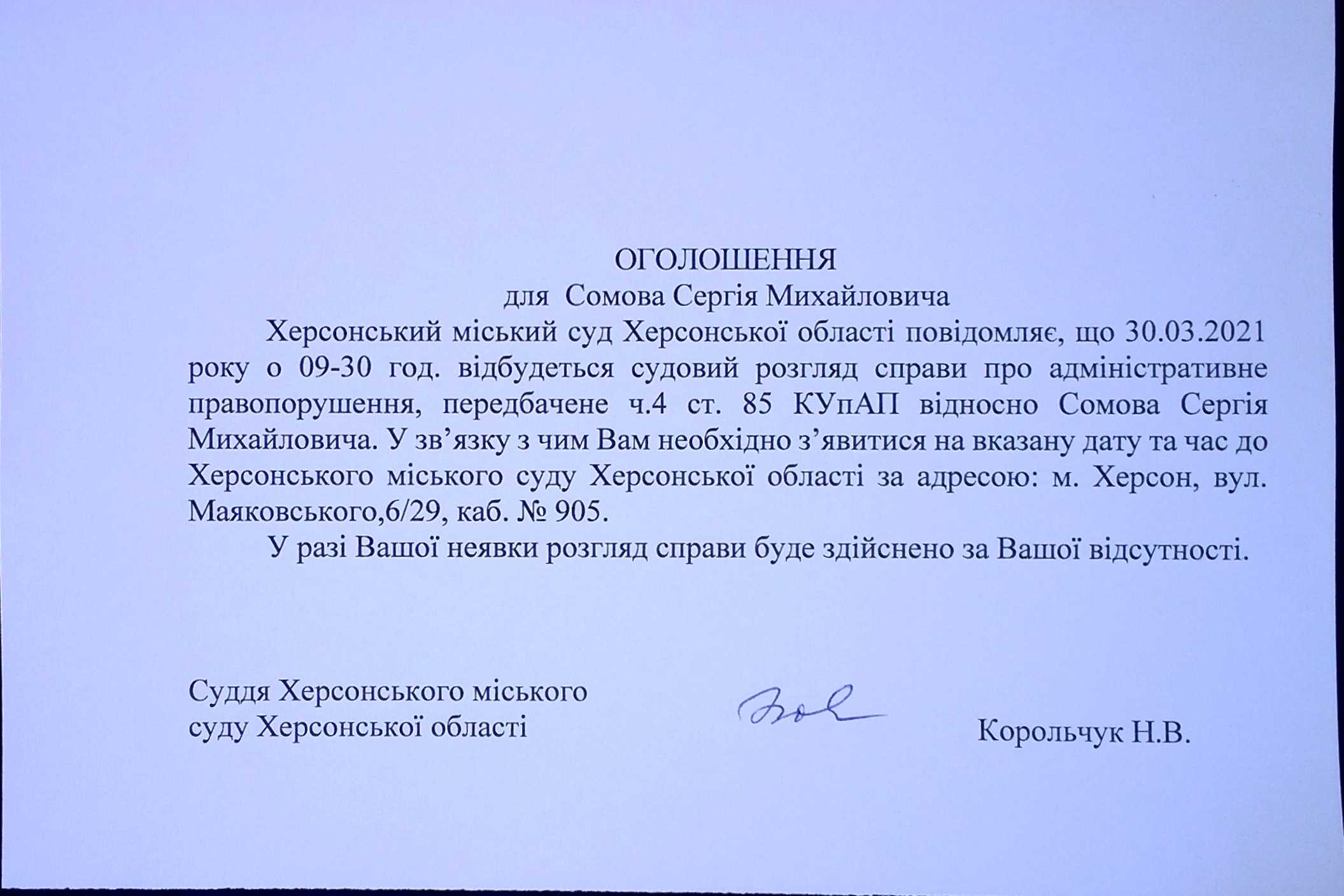 ОГОЛОШЕННЯ для Сомова Сергія Михайловича