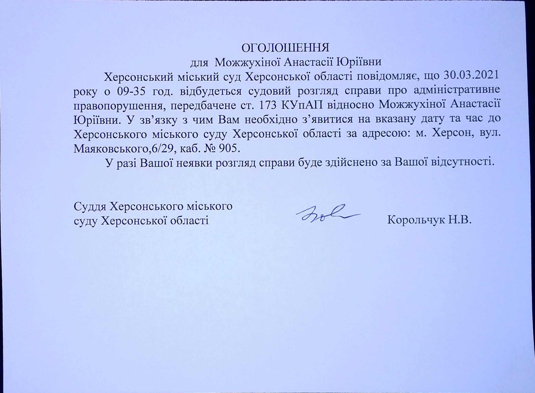 ОГОЛОШЕННЯ для Можжухіної Анастасії Юріївни