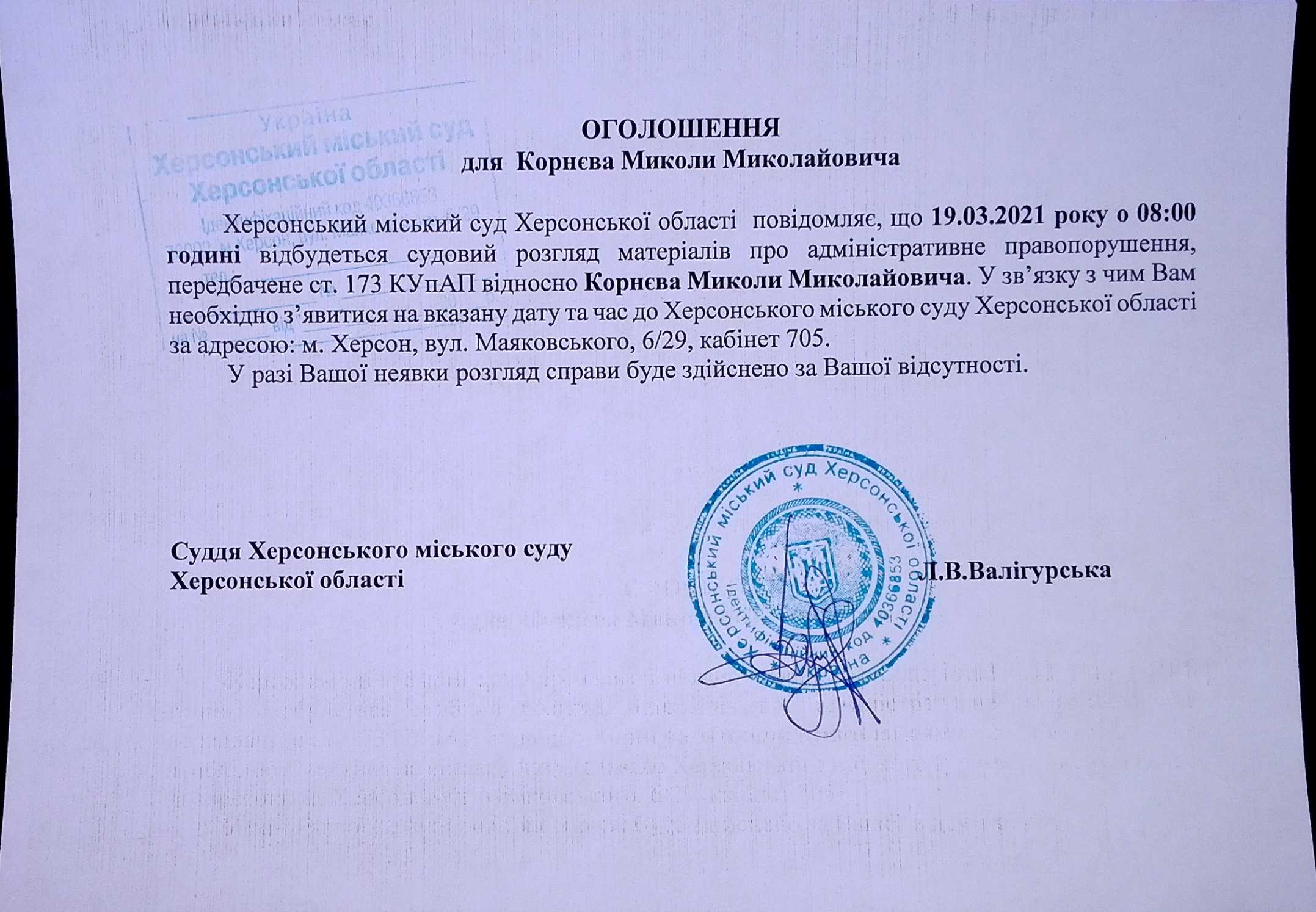 ОГОЛОШЕННЯ для Корнєва Миколи Миколайовича