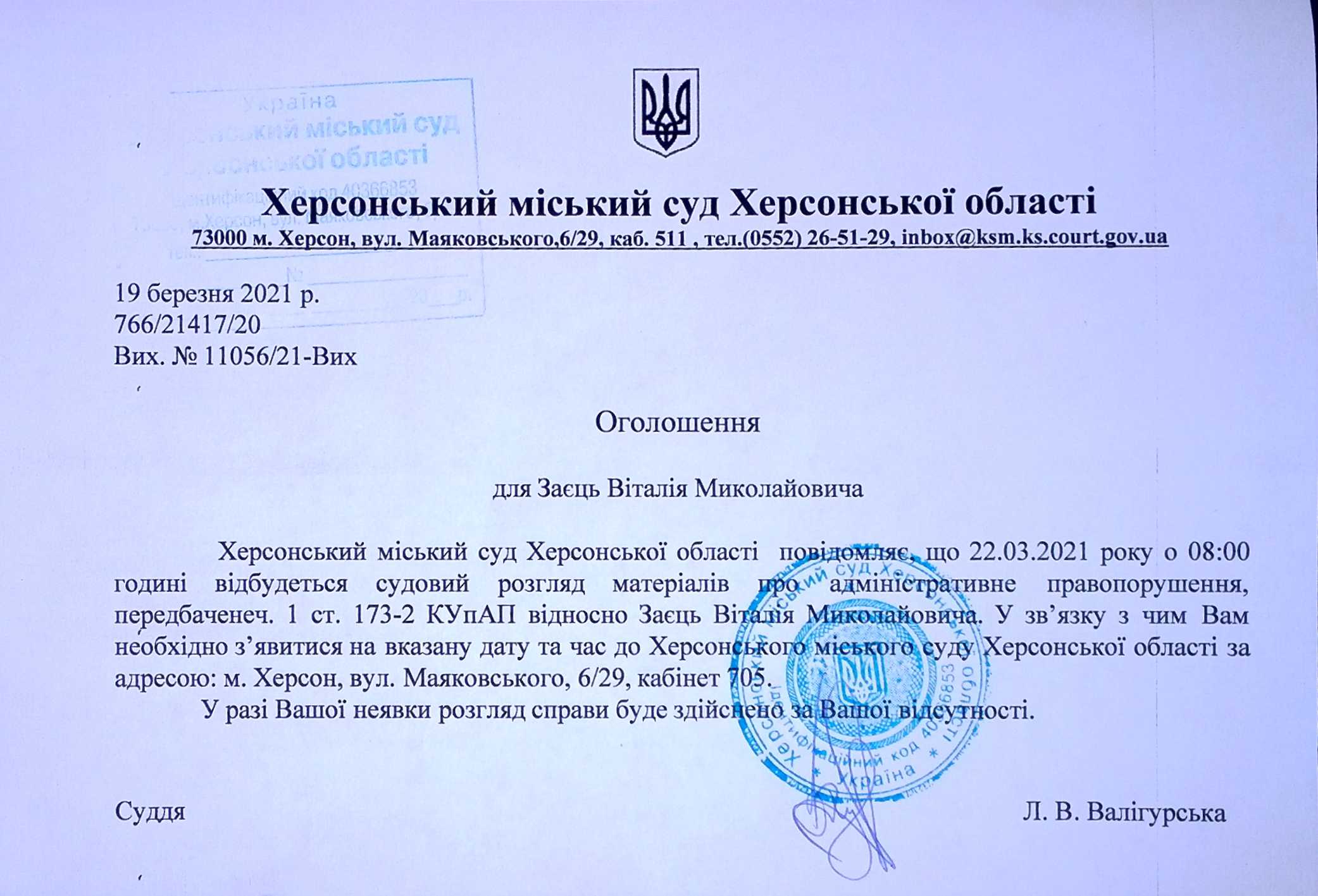 ОГОЛОШЕННЯ ПРО ВИКЛИК ДО СУДУ