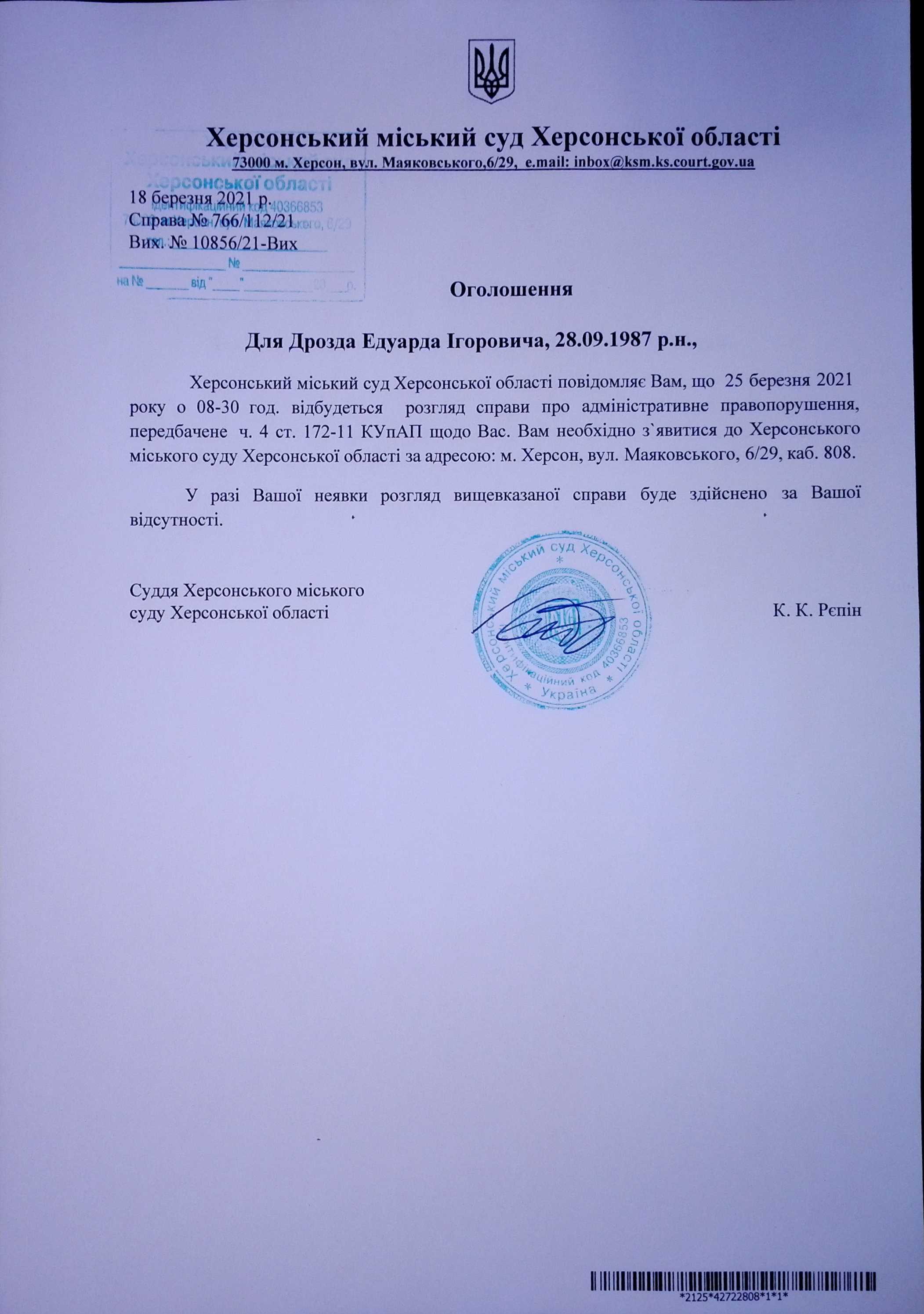 ОГОЛОШЕННЯ для Дрозда Едуарда Ігоровича