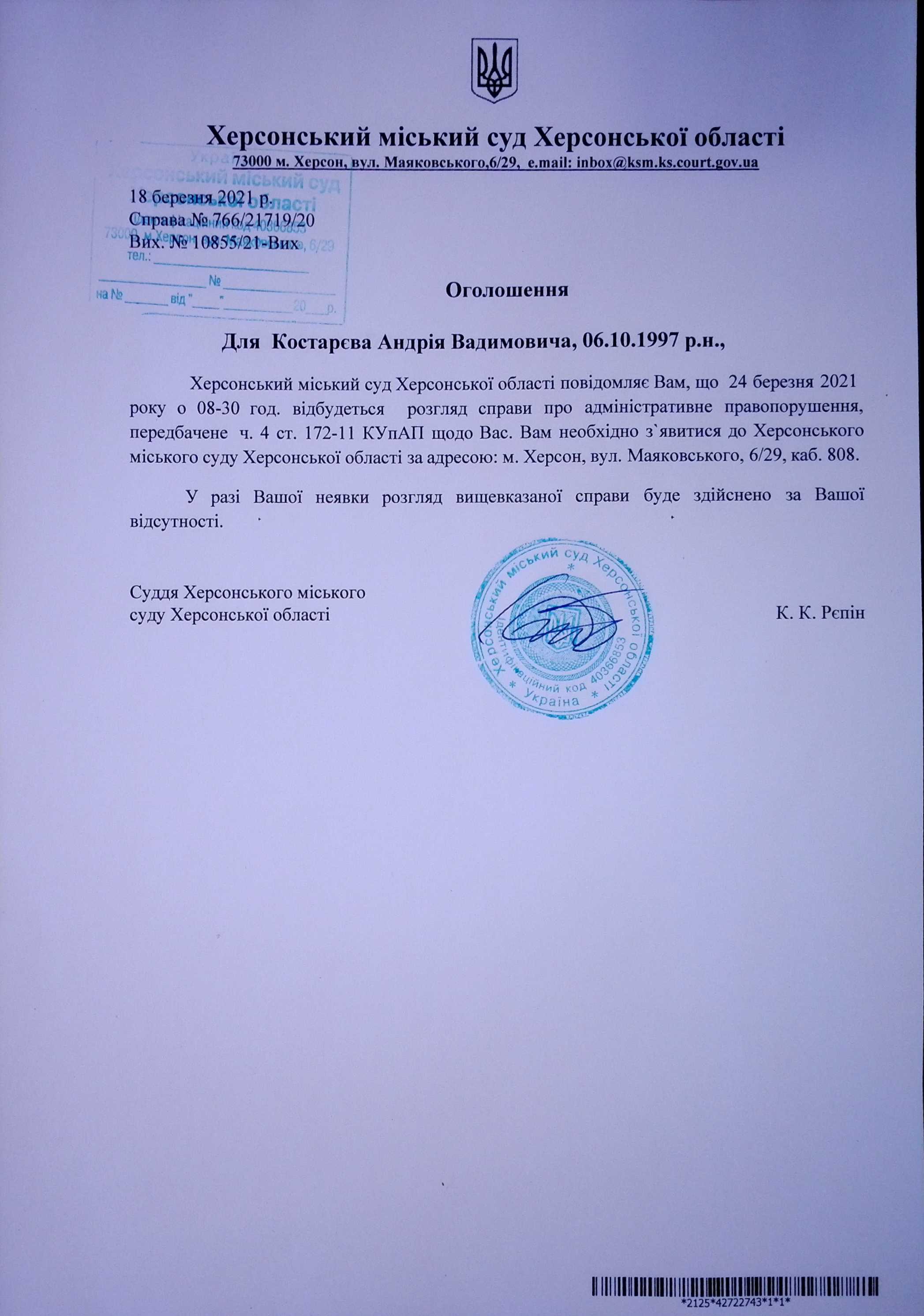 ОГОЛОШЕННЯ для Костарєва Андрія Вадимовича