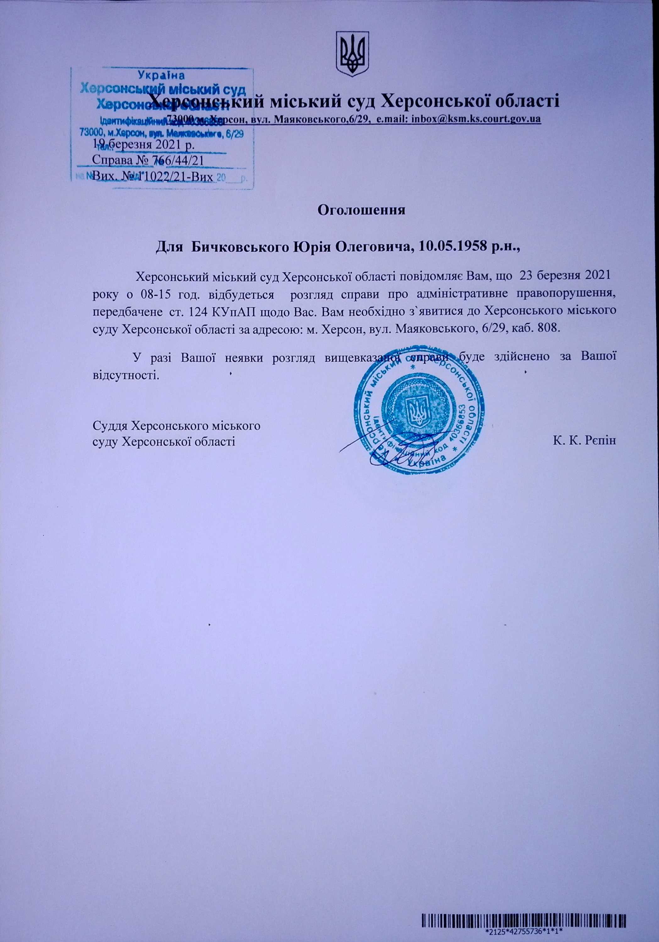 ОГОЛОШЕННЯ для Бичковського Юрія Олеговича