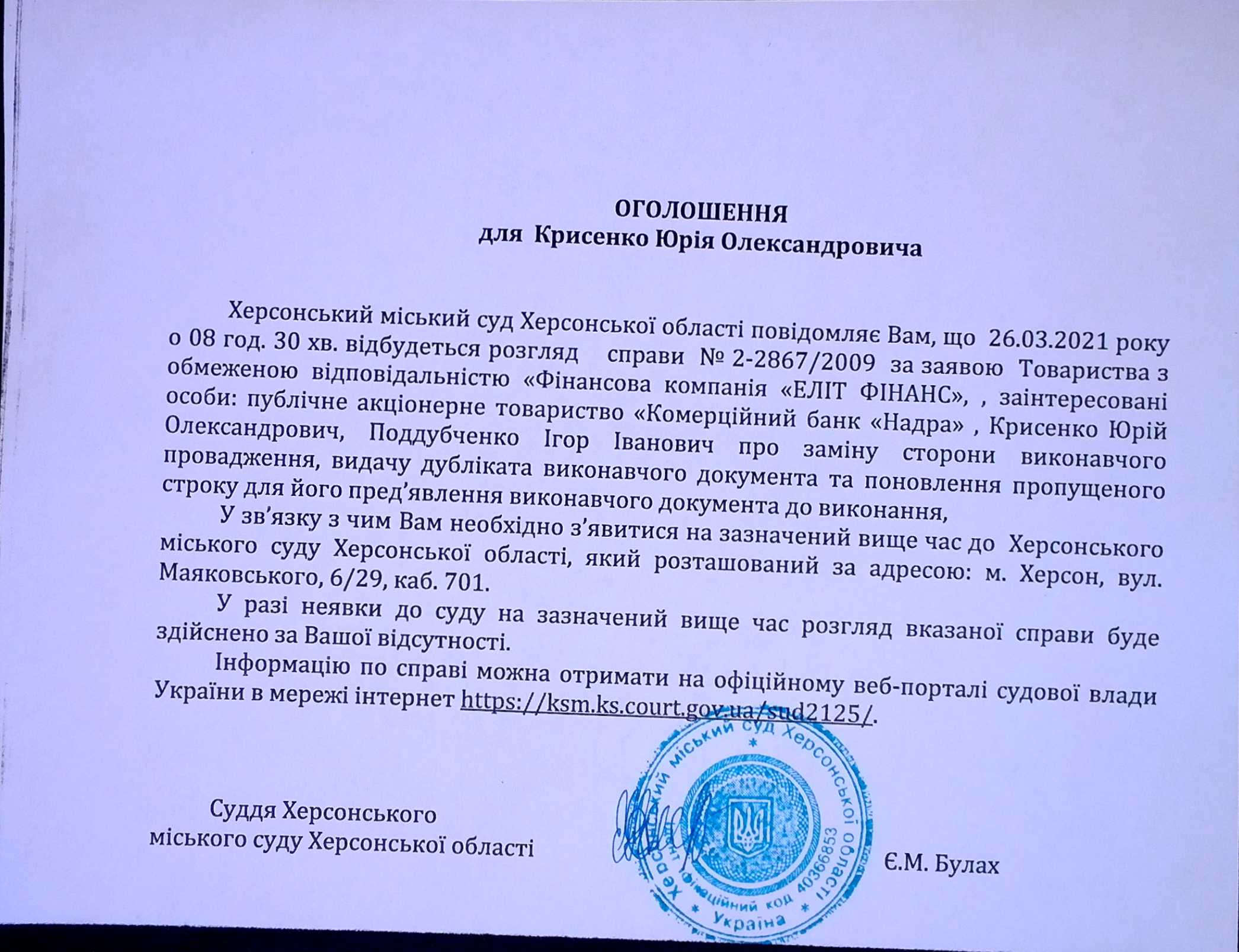 ОГОЛОШЕННЯ для Крисенко Юрія Олександровича