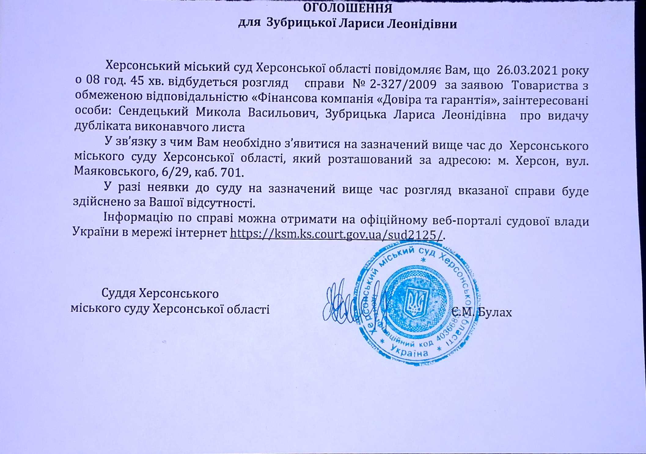 ОГОЛОШЕННЯ для Зубрицької Лариси Леонідівни