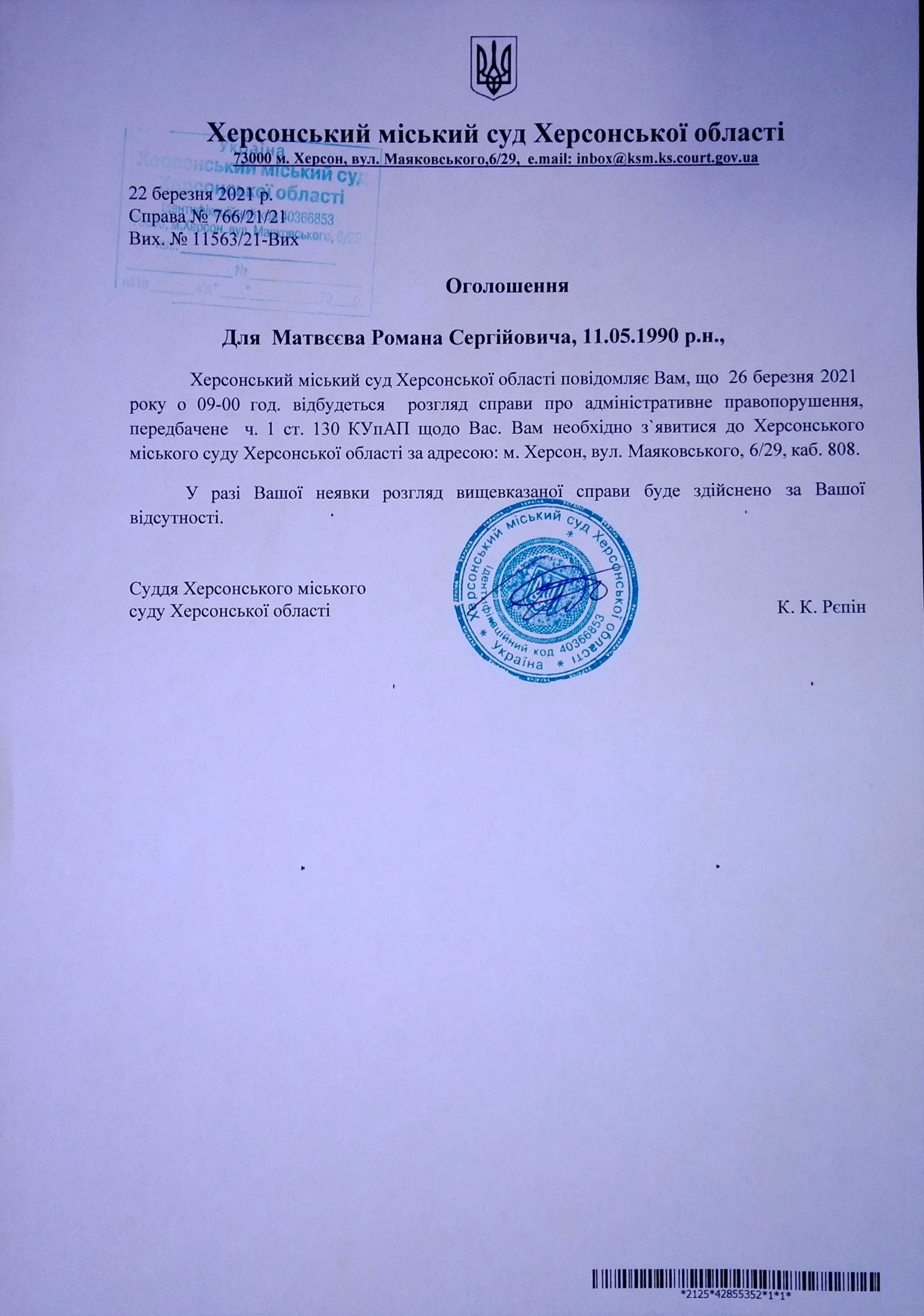 ОГОЛОШЕННЯ для Матвєєва Романа Сергійовича
