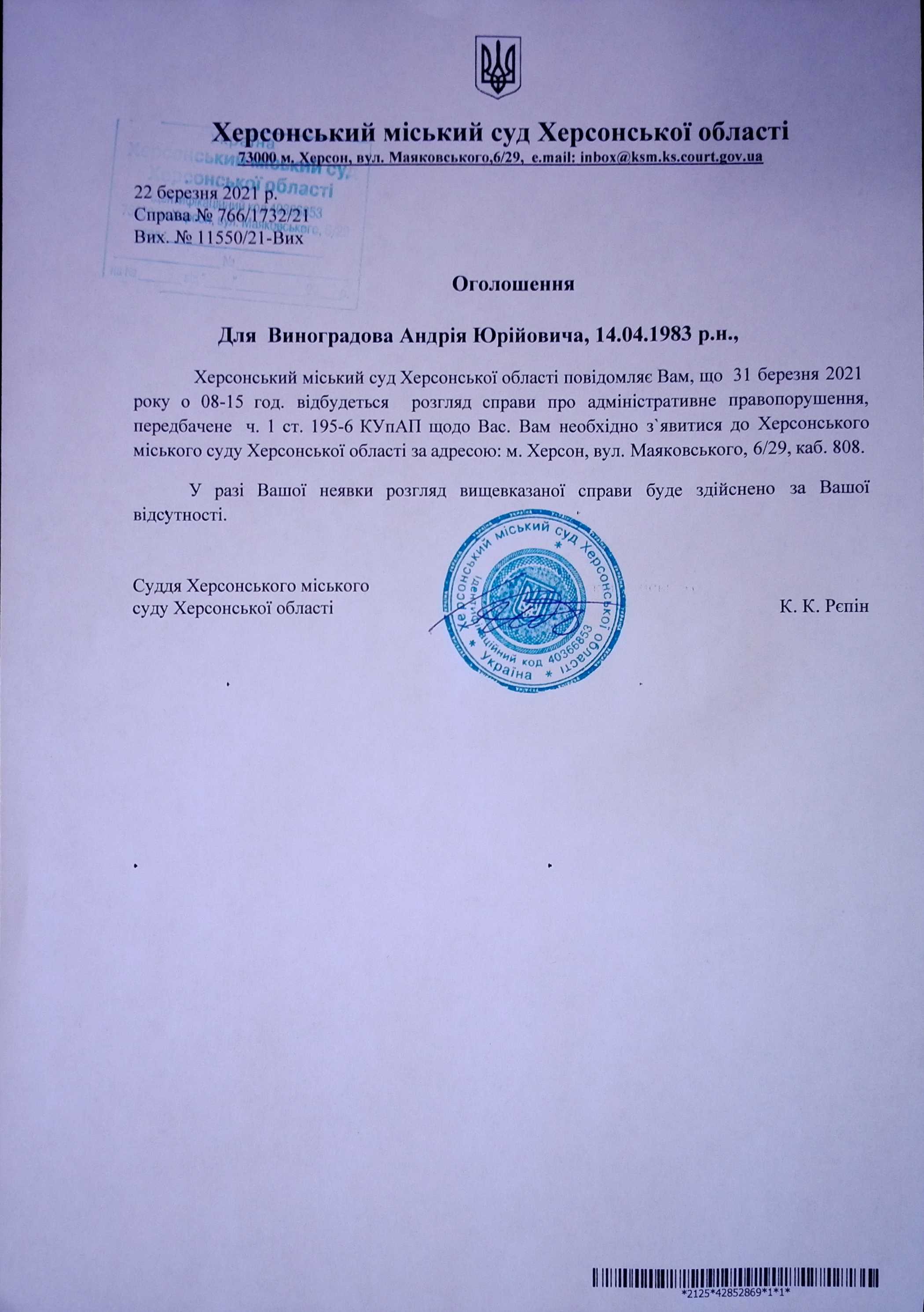 ОГОЛОШЕННЯ для Виноградова Андрія Юрійовича