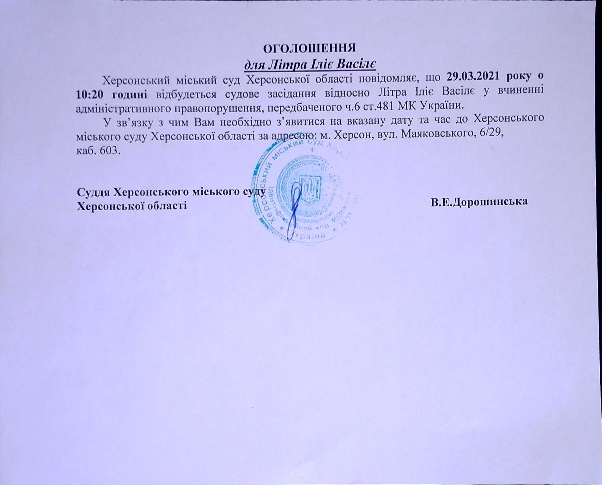 ОГОЛОШЕННЯ для Літра Іліє Васілє