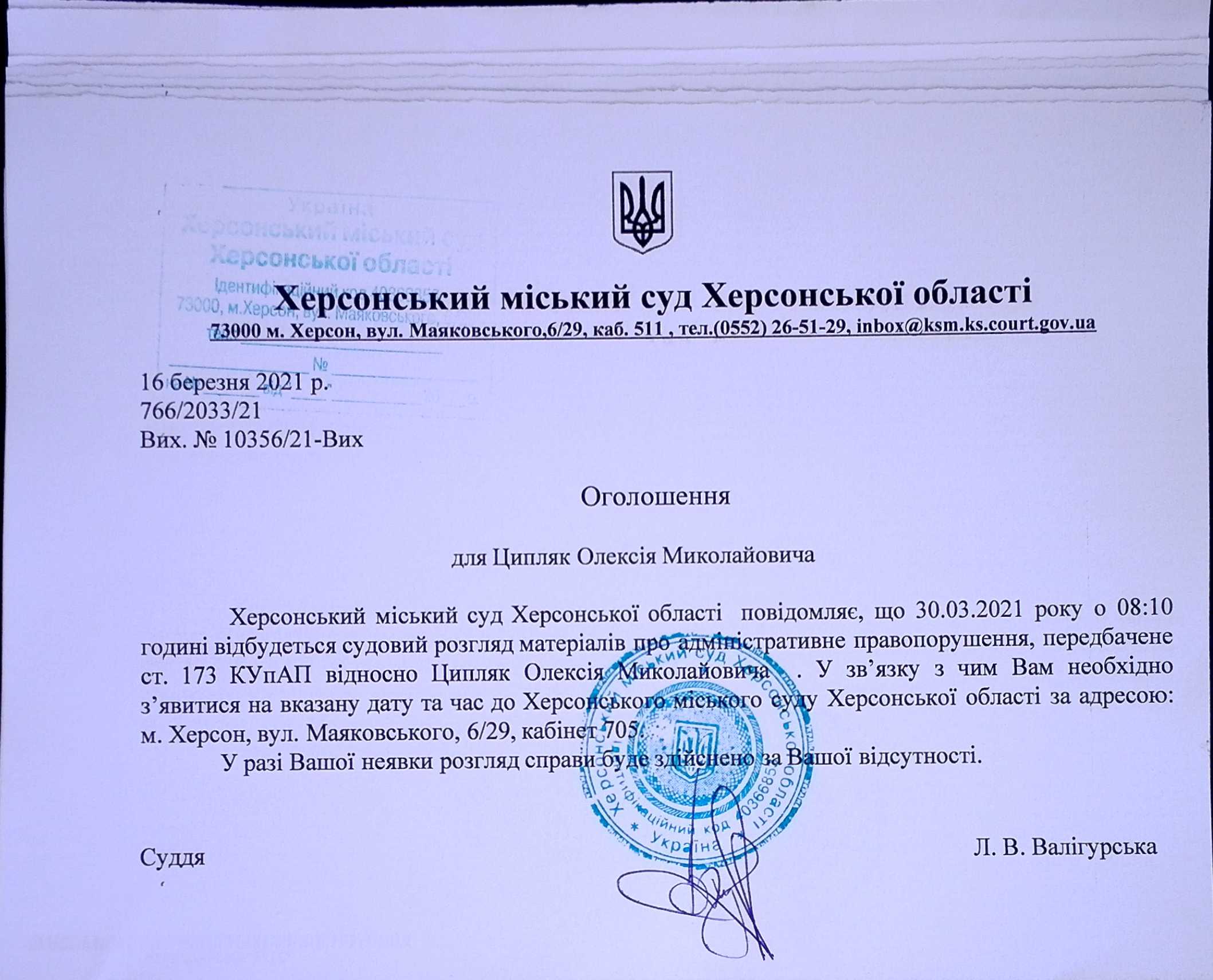 ОГОЛОШЕННЯ для Ципляка Олексія Миколайовича