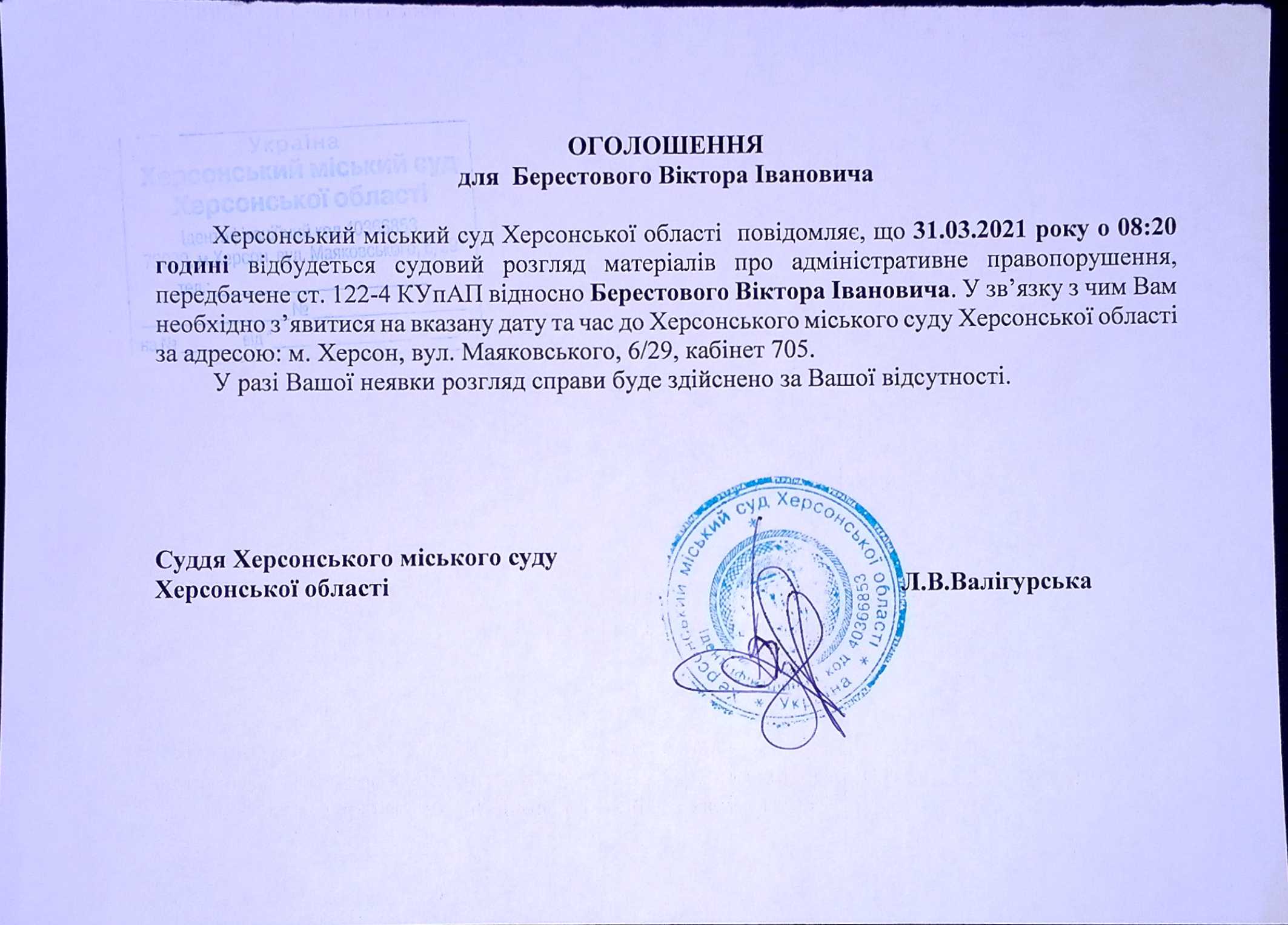 ОГОЛОШЕННЯ для Берестового Віктора Івановича