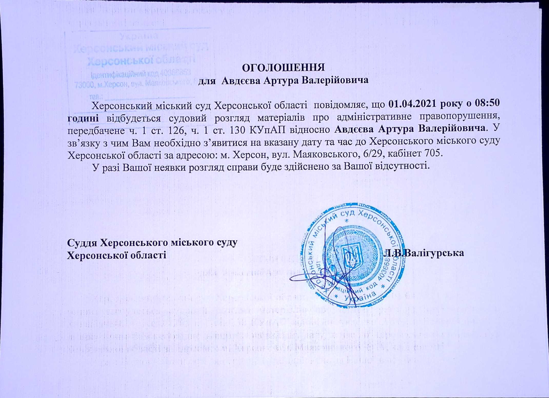 ОГОЛОШЕННЯ для Авдєєва Артура Валерійовича