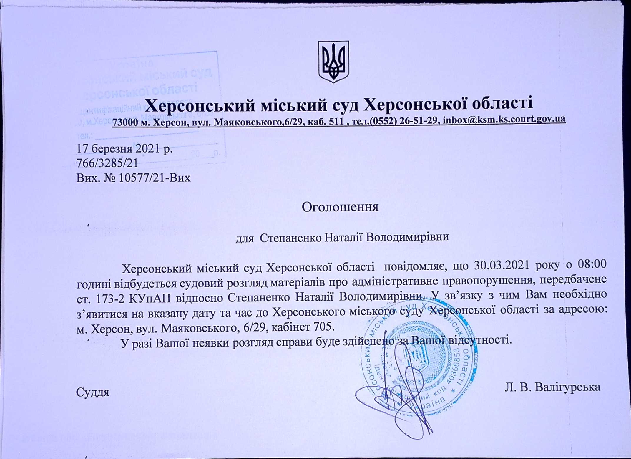 ОГОЛОШЕННЯ для Степаненко Наталії Володимирівни
