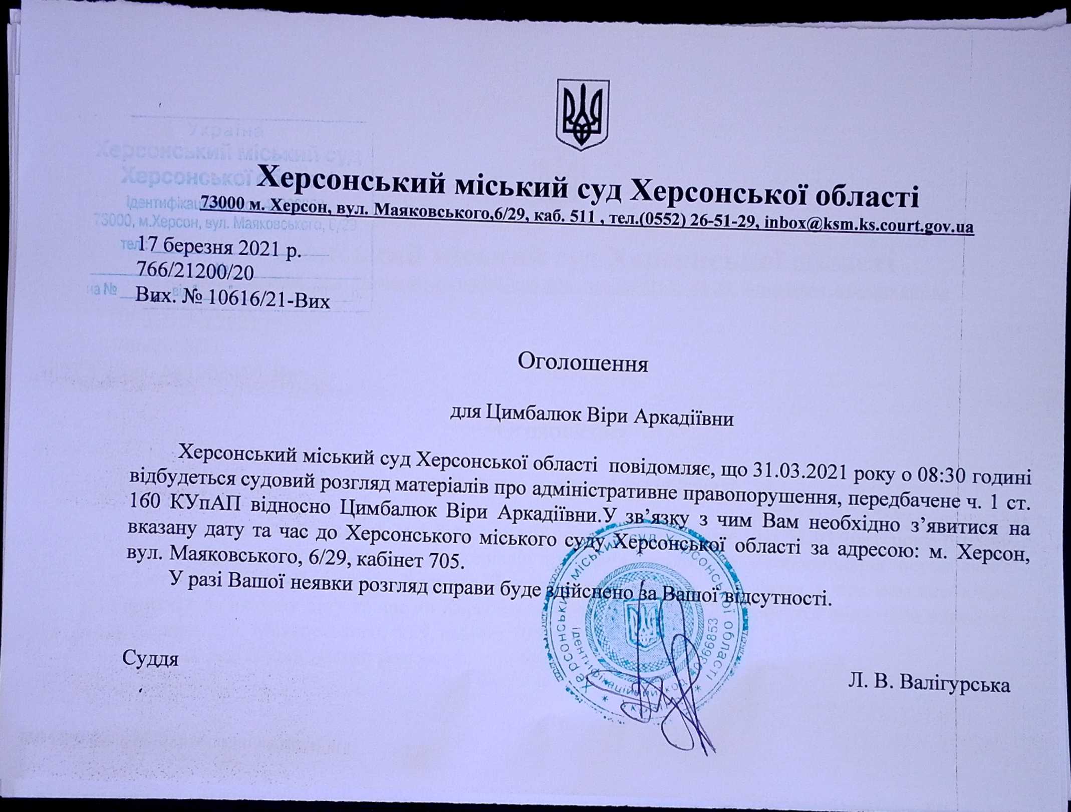 ОГОЛОШЕННЯ для Цимбалюк Віри Аркадіївни