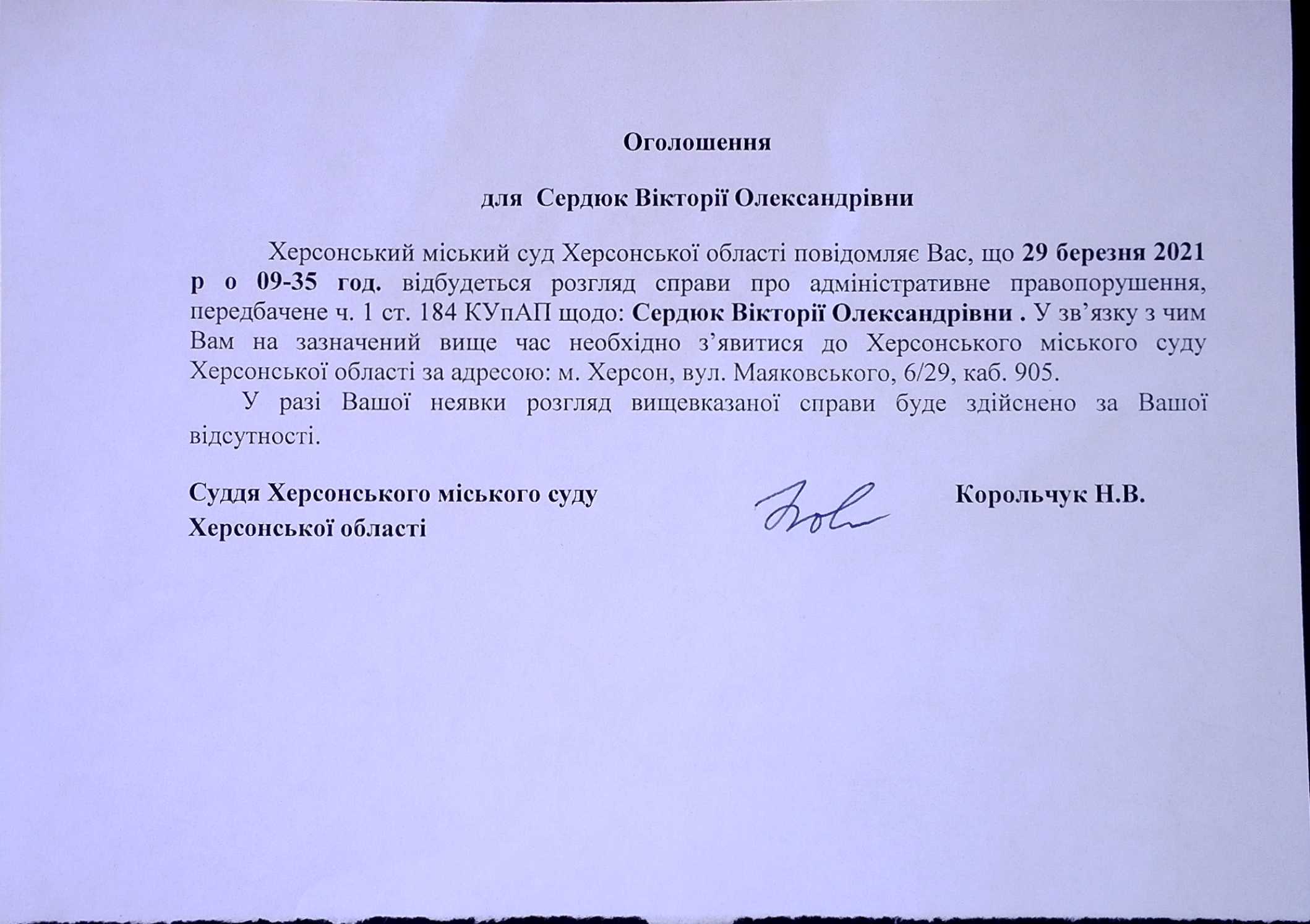 ОГОЛОШЕННЯ для Сердюк Вікторії Олександрівни