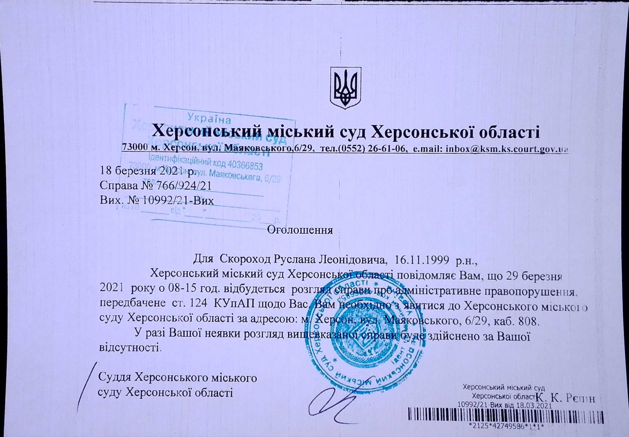 ОГОЛОШЕННЯ для Скороход Руслана Леонідовича