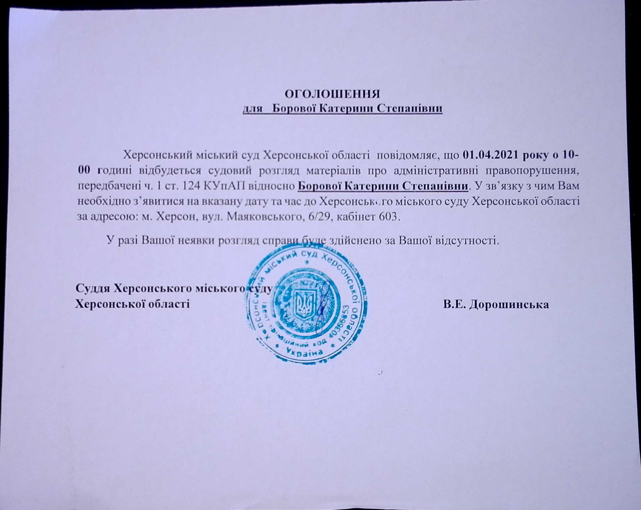 ОГОЛОШЕННЯ для Борової Катерини Степанівни