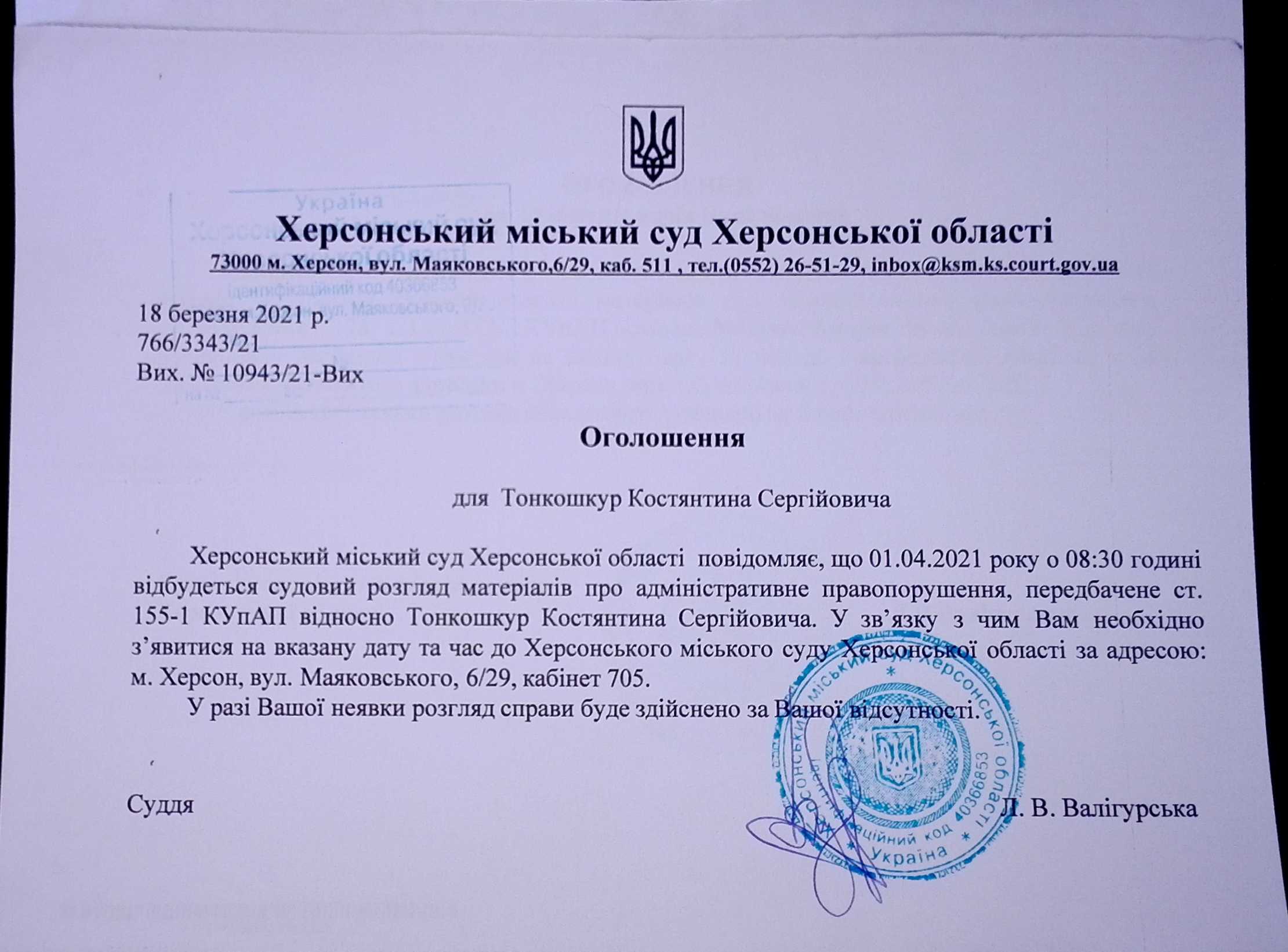 ОГОЛОШЕННЯ для Тонкошкур Костянтина Сергійовича