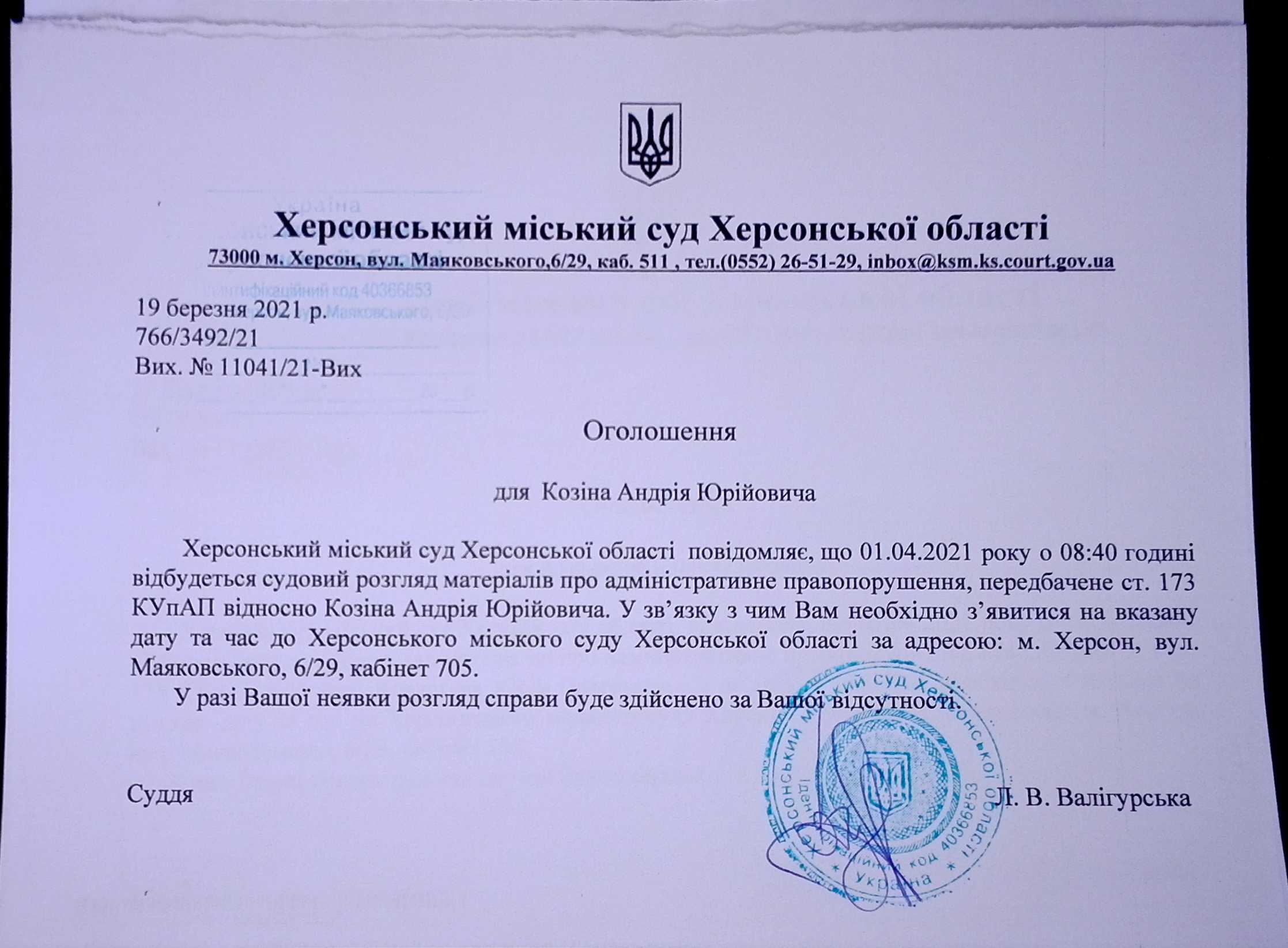 ОГОЛОШЕННЯ ПРО ВИКЛИК ДО СУДУ