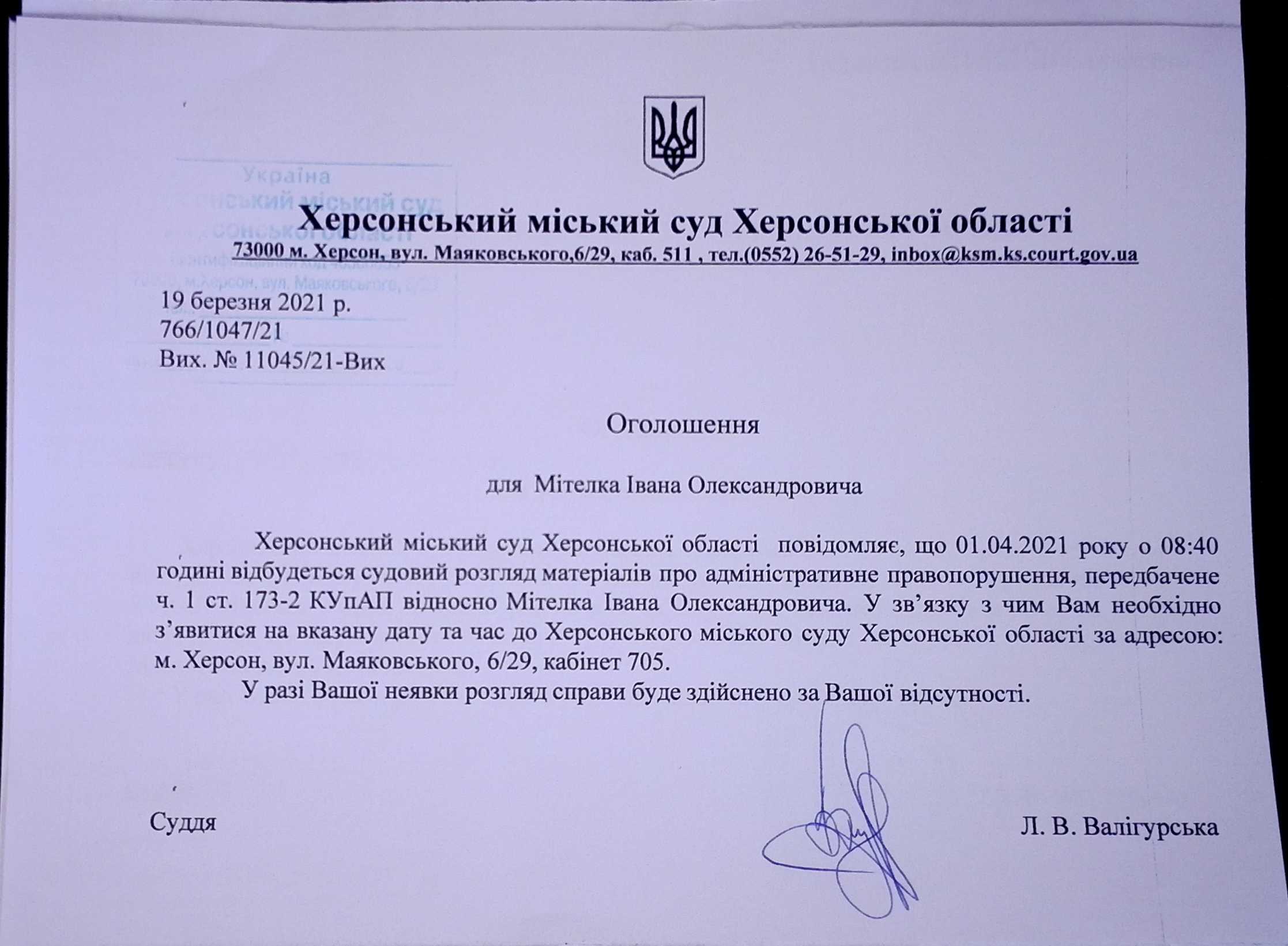 ОГОЛОШЕННЯ ПРО ВИКЛИК ДО СУДУ