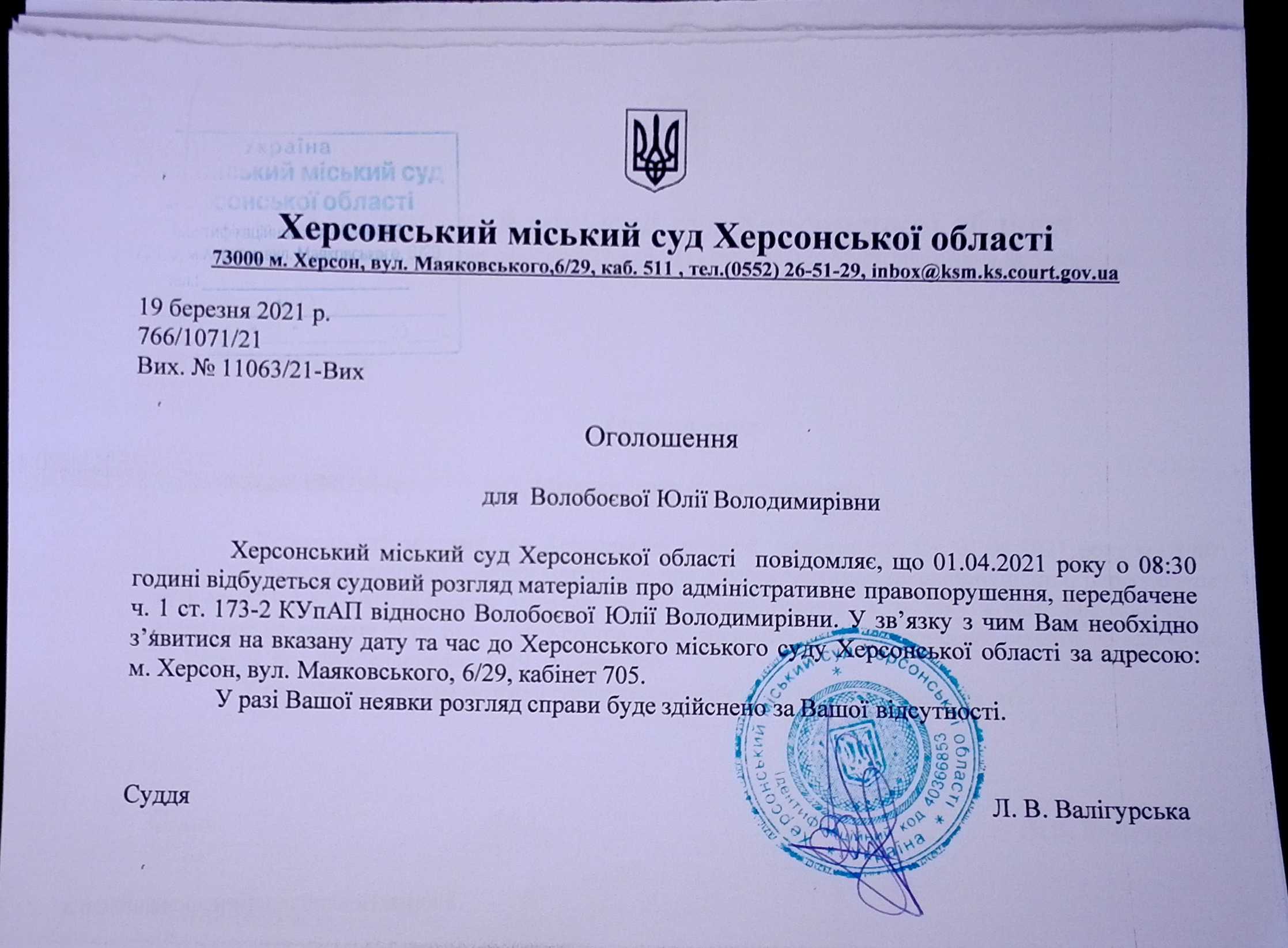ОГОЛОШЕННЯ для Волобоєвої Юлії Володимирівни
