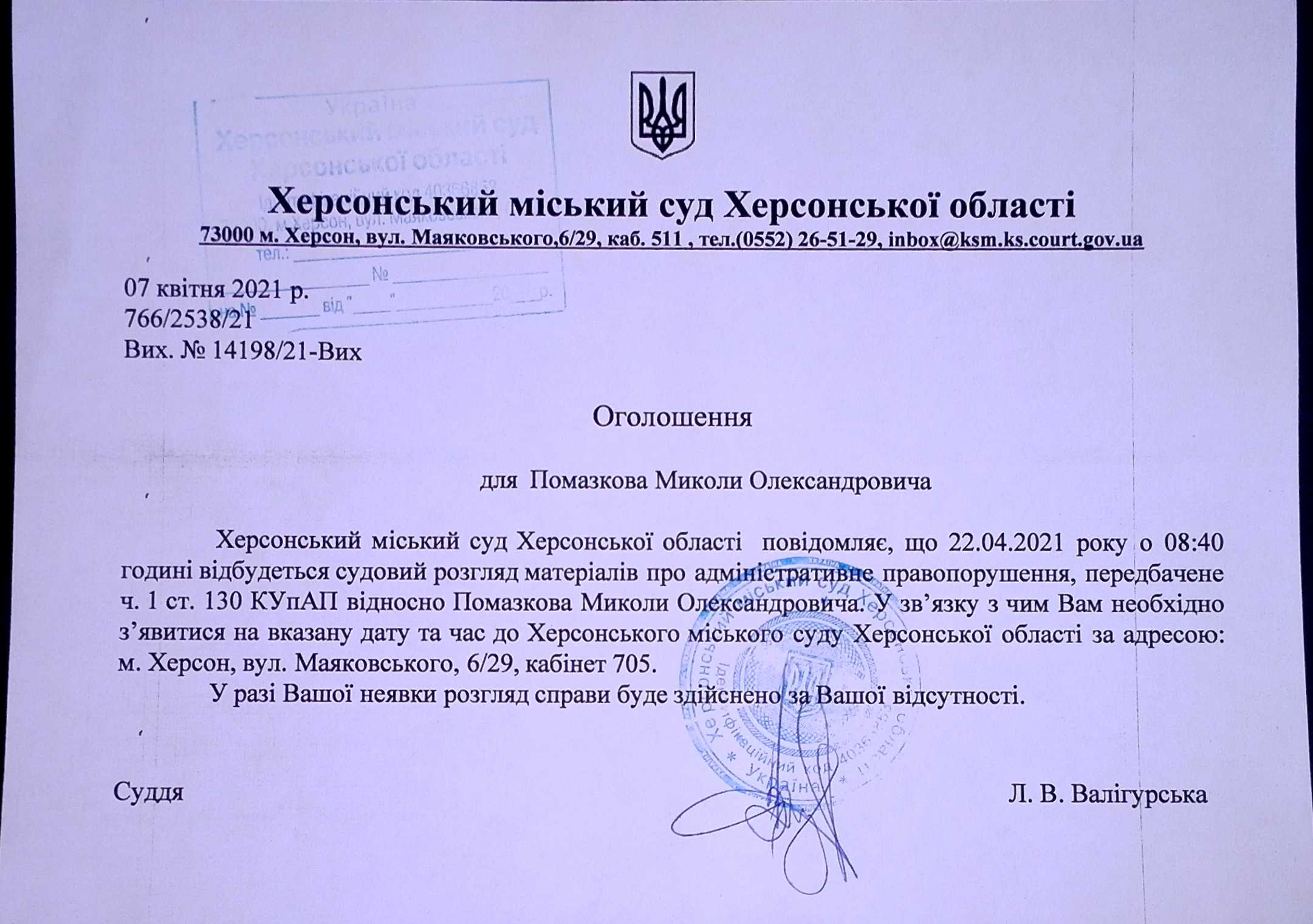 ОГОЛОШЕННЯ для Помазкова Миколи Олександровича