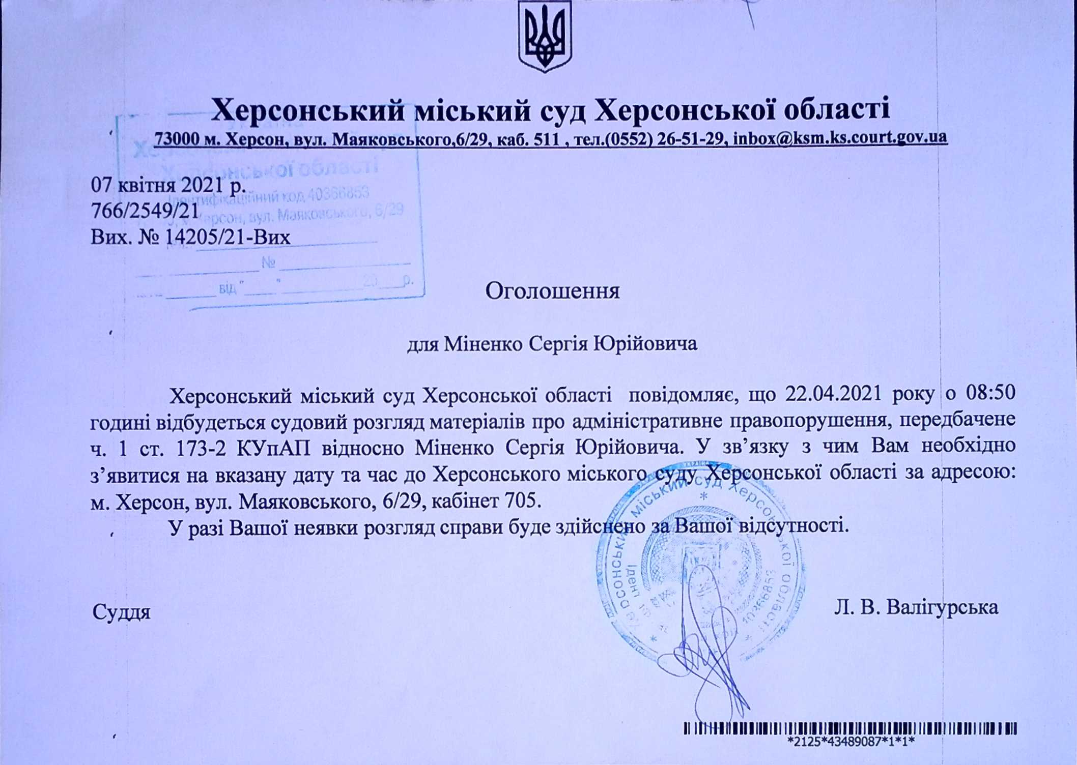 ОГОЛОШЕННЯ для Міненко Сергія Юрійовича
