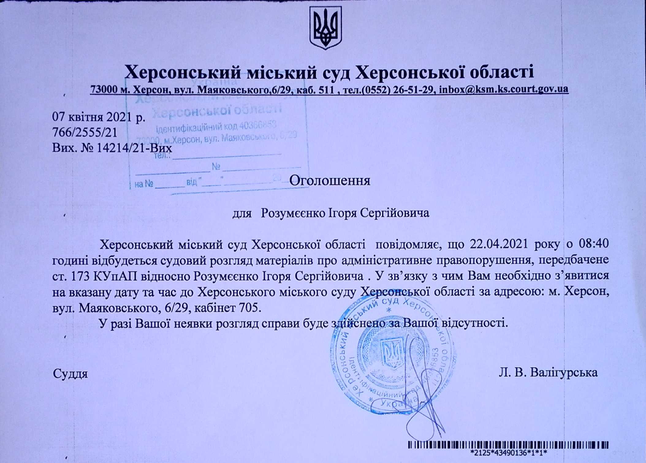 ОГОЛОШЕННЯ для Розумєєнко Ігоря Сергійовича
