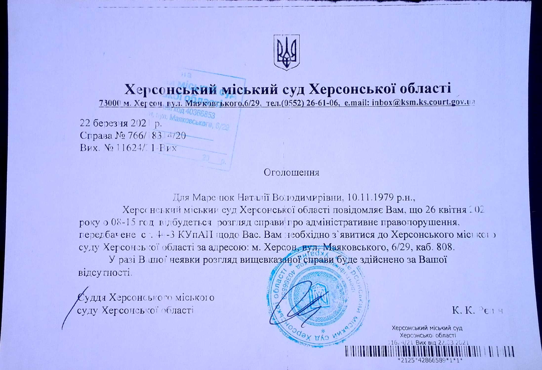ОГОЛОШЕННЯ для Маренюк Наталії Володимирівни