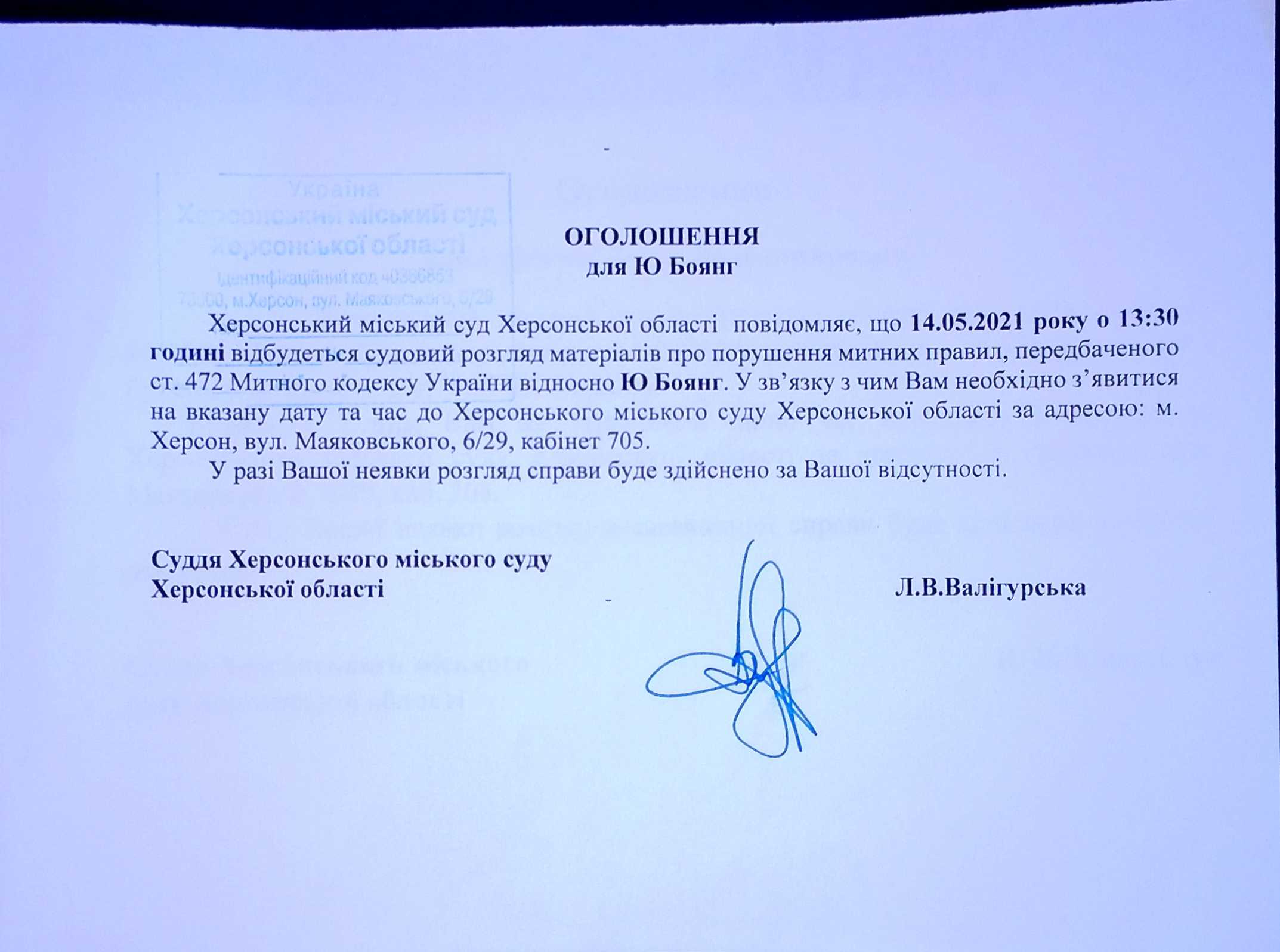ОГОЛОШЕННЯ ПРО ВИКЛИК ДО СУДУ