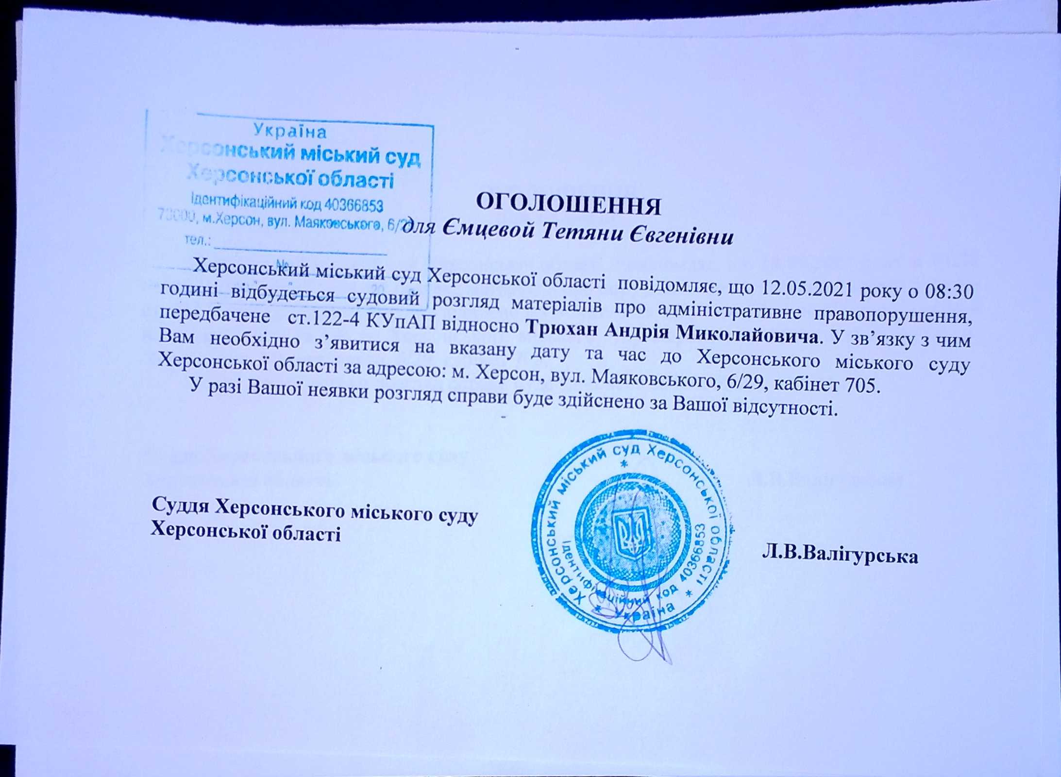 ОГОЛОШЕННЯ для Ємцевої Тетяни Євгенівни