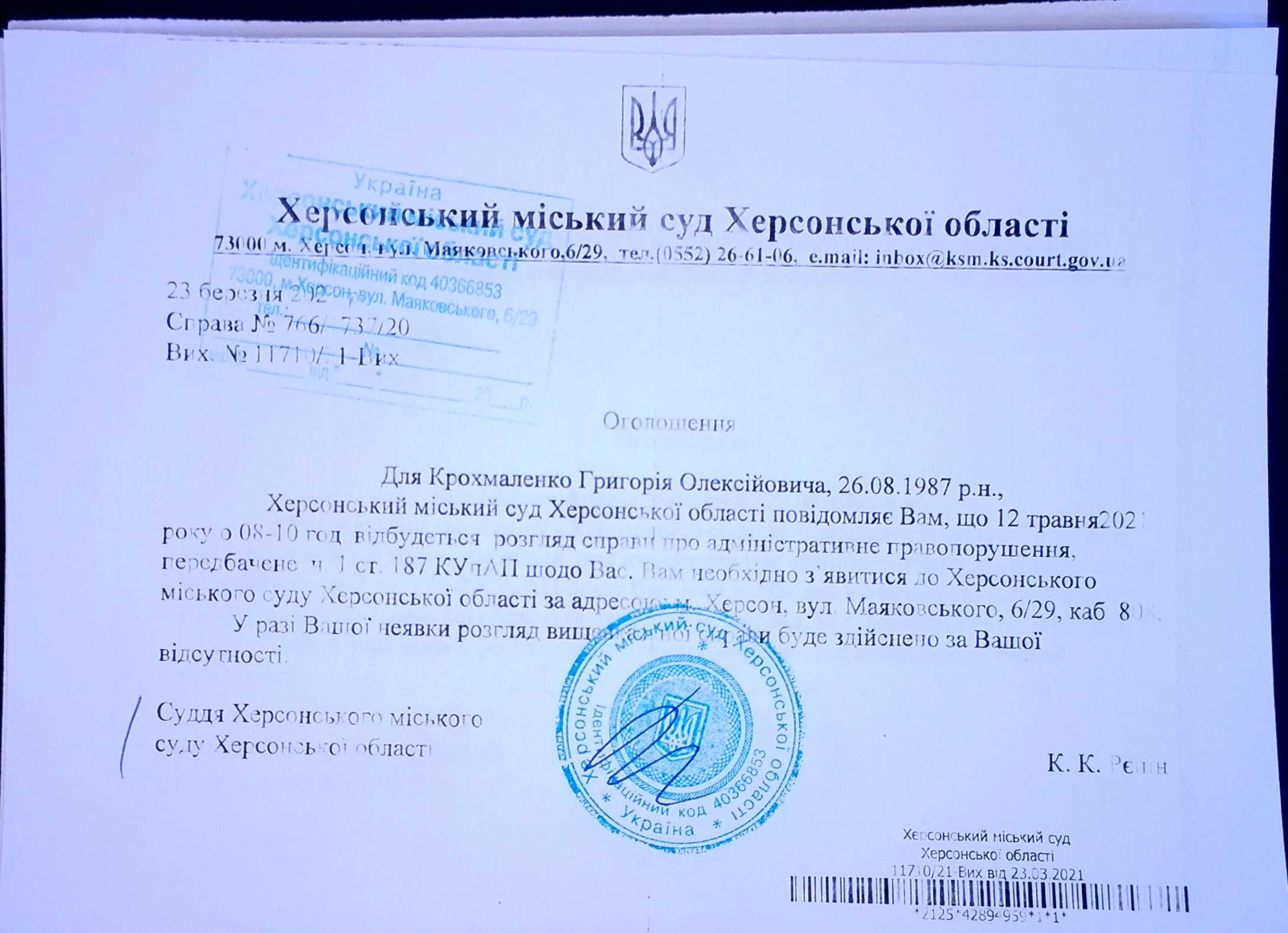 ОГОЛОШЕННЯ для Крохмаленко Григорія Олексійовича