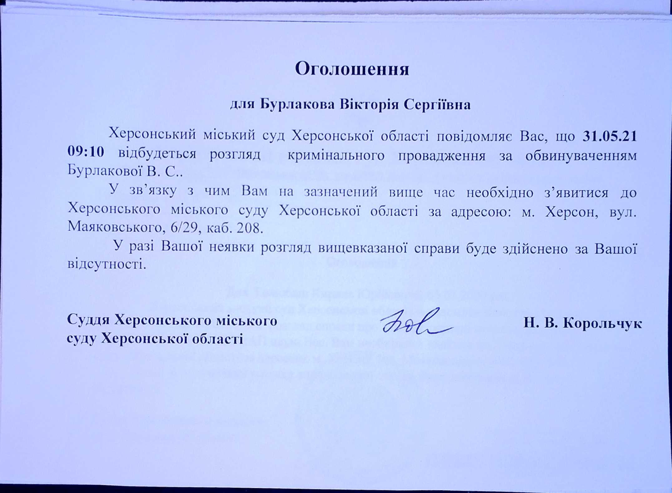 ОГОЛОШЕННЯ для Бурлакова Вікторія Сергіївна