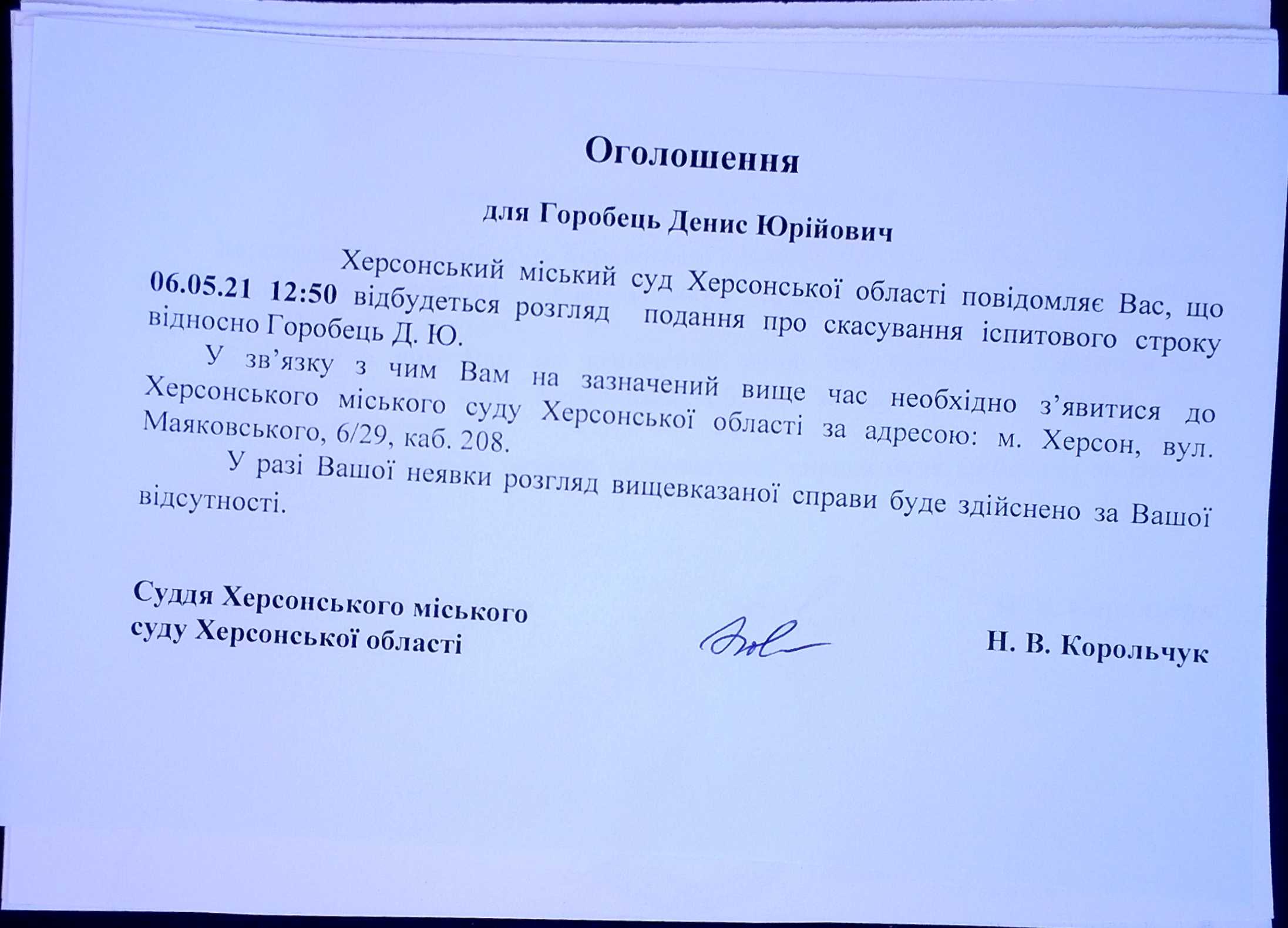 ОГОЛОШЕННЯ ПРО ВИКЛИК ДО СУДУ
