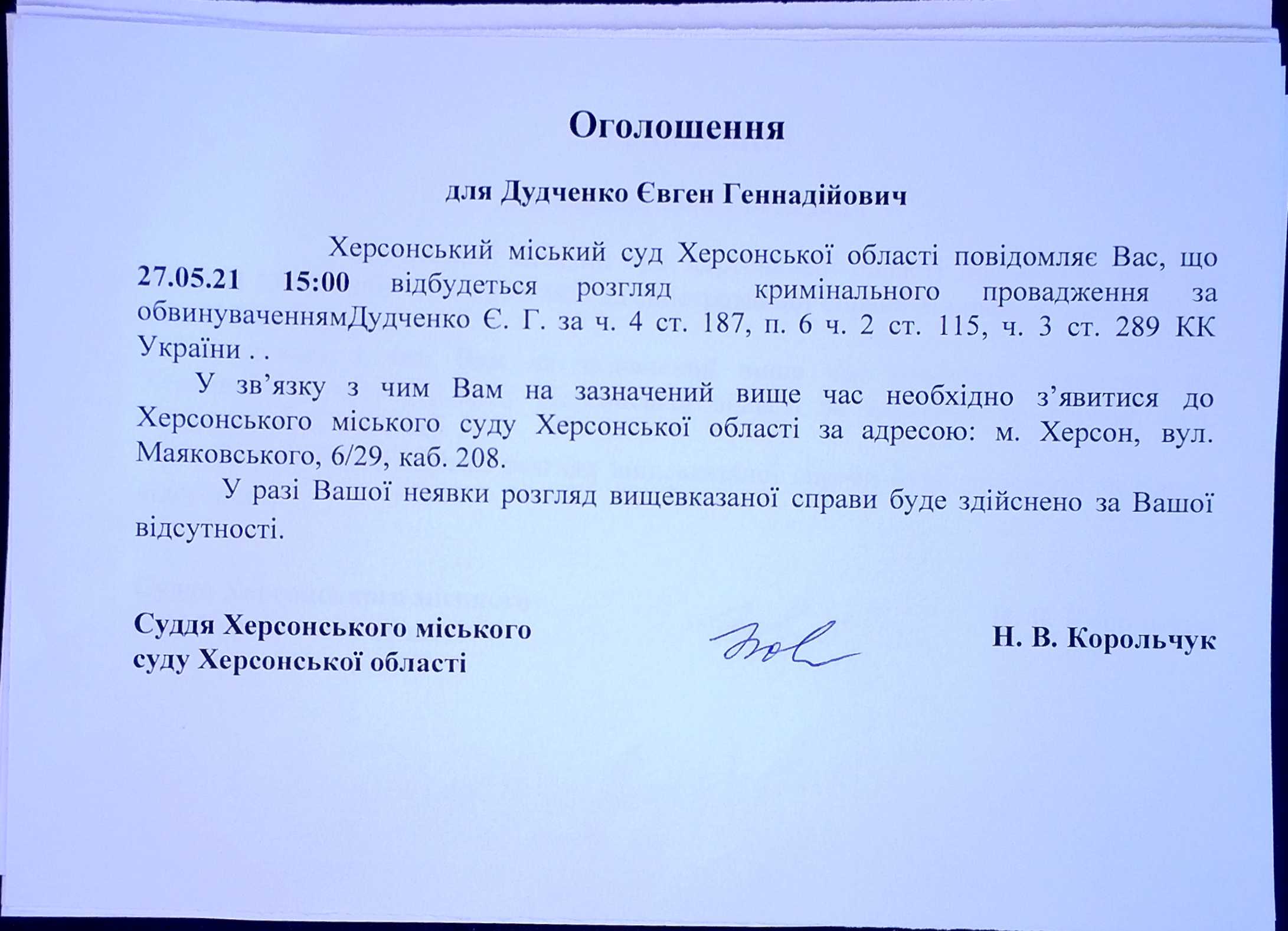 ОГОЛОШЕННЯ для Дудченко Євгена Геннадійовича