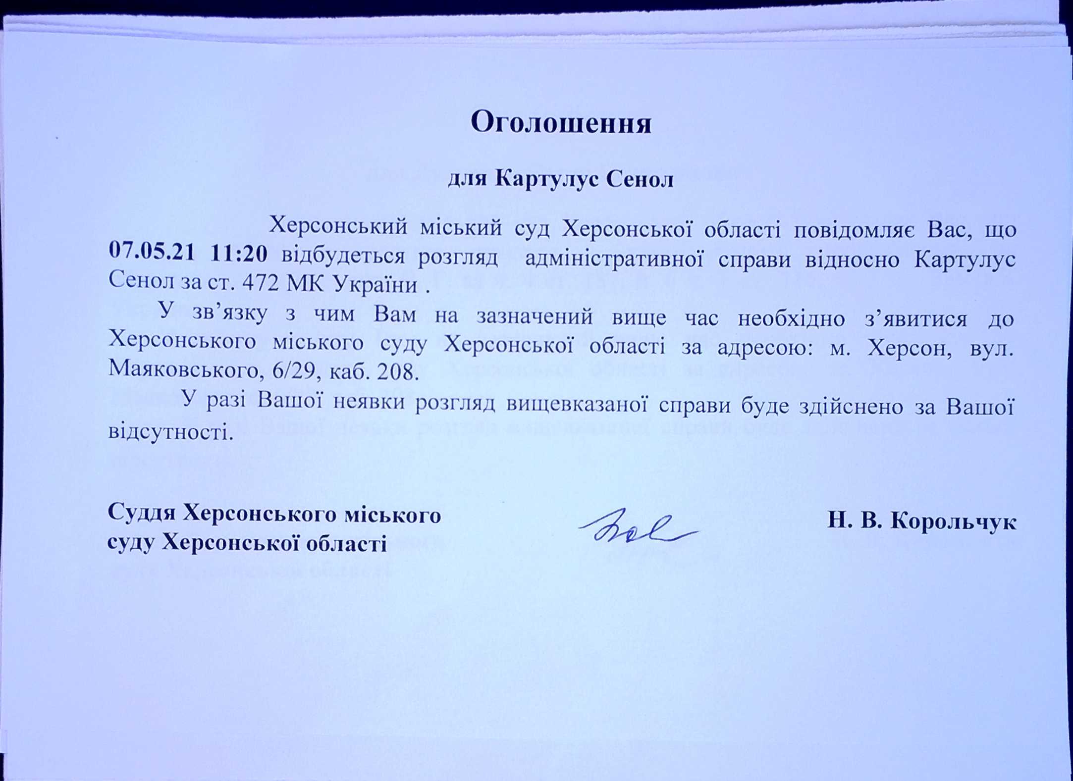 ОГОЛОШЕННЯ ПРО ВИКЛИК ДО СУДУ