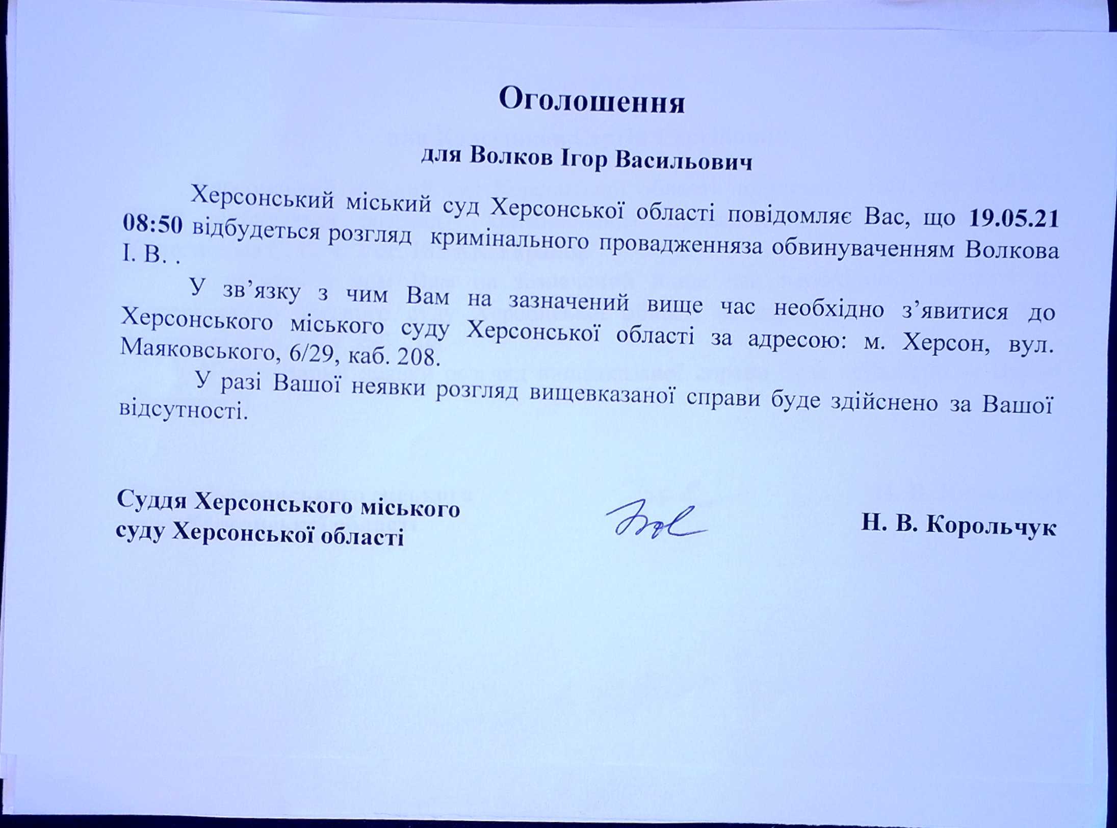 ОГОЛОШЕННЯ для Волкова Ігоря Васильовича