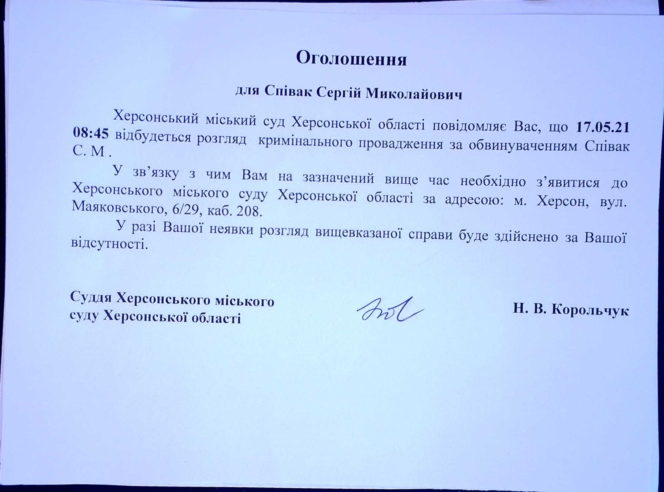 ОГОЛОШЕННЯ для Співак Сергія Миколайовича