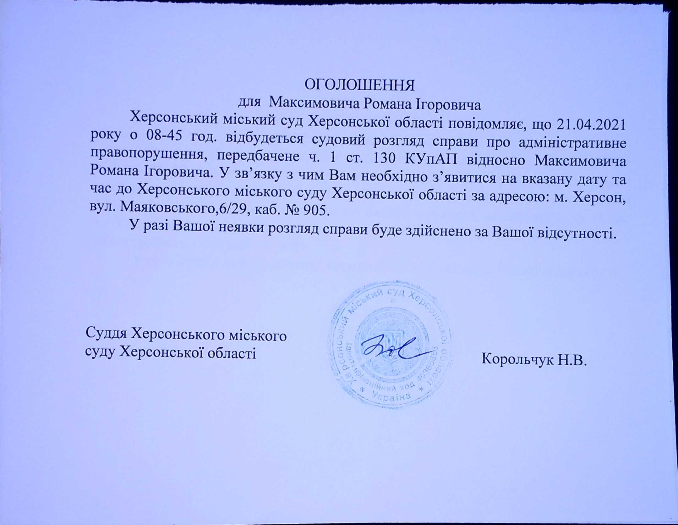 ОГОЛОШЕННЯ для Максимовича Романа Ігоровича